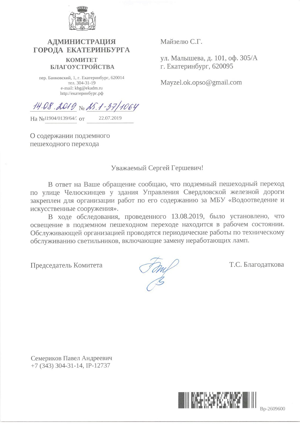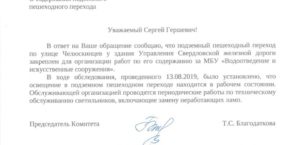 Номер жалобы:57524 Тип жалобы:Прочее Название объекта:мэрия Регион:Свердловская область Город:Екатеринбург Адрес:улица Челюскинцев Описание жалобы:В подземном переходе у остановки «Управление дороги» тускло работают лампочки. Статус: