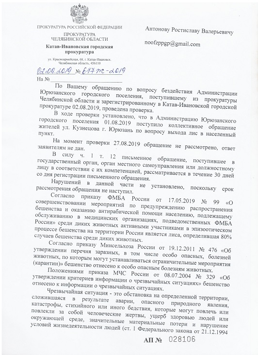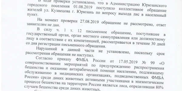 Номер жалобы:57553 Тип жалобы:Прочее Название объекта: Регион:Челябинская область Город:Юрюзань Адрес:Советская улица, 33 Описание жалобы:Помогите! Очень частое наподение лис на животных(домашний скот), люди страдают о потере гусей, кур... Уже становится страшно выходить в огород. Нападения происходят уже среди дня!!! Власти в курсе событий,люди ходят жалуются в администрацию, меры никакие не предпринимаются. Все знают где они обитают, видели 7 лисят, они скоро подрастут, и нападения увеличатся! Помогите Статус: