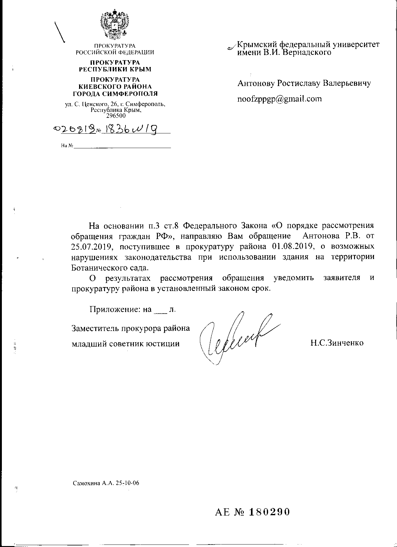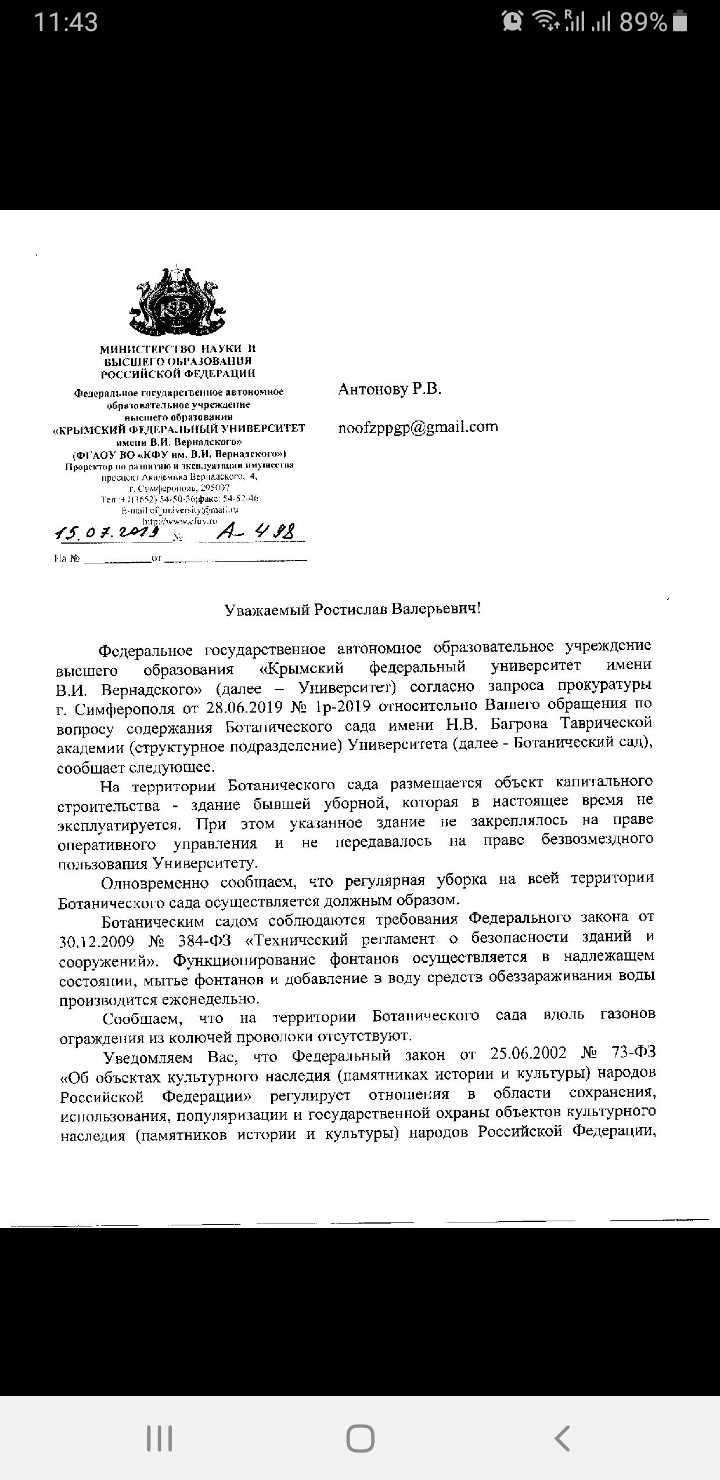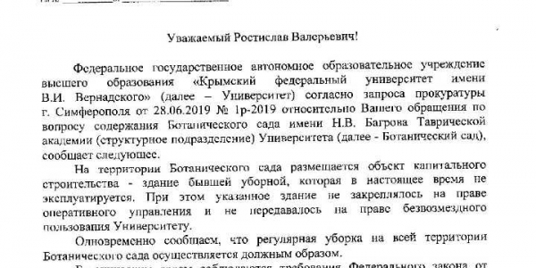 Номер жалобы:57574 Тип жалобы:Прочее Название объекта: Регион:Республика Крым Город:Симферополь Адрес:Ботанический сад имени Н.В. Багрова Крымского федерального университета имени В.И. Вернадского Описание жалобы:56701. в прокуратуру: