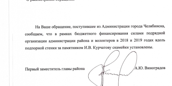 Номер жалобы:57455 Тип жалобы:Прочее Название объекта: Регион:Челябинская область Город:Челябинск Адрес:проспект Ленина, 86 Описание жалобы:1507-17 Раньше на трк Курчатов были лавочки. Потом их убрали. Пустует большая красивая площадь для отдыха. Есть возможность вернуть лавочки? Людям негде сидеть. Статус: