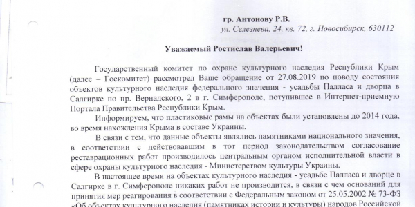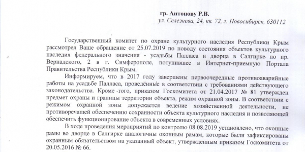 2. Объекты культурного наследия, находящиеся на территории ботанического сада им. Н.В. Багрова, такие как Дом академика П.С. Палласа(распоряжение правительства РФ от 17. 10.2015 номер 2073-р, решение крымского облисполкома от 15.01.1980 номер 16) и Дом графа М.С. Воронцова(распоряжение правительства РФ от 17. 10.2015 номер 2073-р) находятся в плачевном состоянии. Так оригинальные оконные деревянные рамы, с одинарным остеклением, заменены на пластиковые рамы со стеклопакетами, что не соответствует исторической эпохе здания. Вдобавок разрушена историко-градостроительная среда вокруг объекта культурного наследия-установлен металлический гараж, установлен забор с сеткой рабицей, что является нарушением ст 5.1. п1 п.п 1 Федерального закона "Об объектах культурного наследия (памятниках истории и культуры) народов Российской Федерации" от 25.06.2002 N 73-ФЗ. Статус: