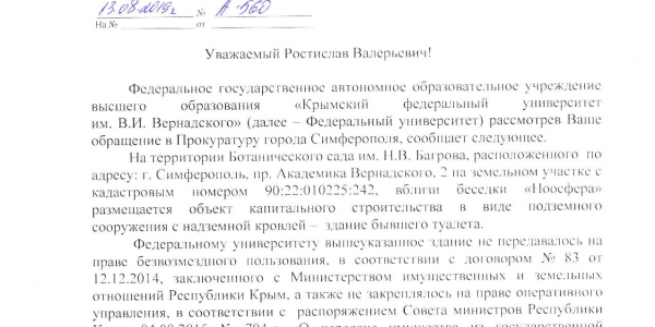 1. Прошу решить вопрос по содержанию и принадлежности "уборной" на территории ботанического сада Н.В. Багрова, являющимся особо охраняемой природной территорией, являющийся структурным подразделением ФГАОУ ВО " Крымский федеральный университет им. В.И. Вернандского". Уборная содержится в аварийном состоянии( нет доступа в туалет- закрыты двери в мужской туалет, нет сантехоборудования, бетонная плита покрытия не защищена от осадков- разрушен кровельный ковер, трещины и частичное разрушение бетонной плиты покрытия), что является нарушением требований ст. 36 ФЗ "Технического регламента о безопасности зданий и сооружений", "безопасность здания или сооружения в процессе эксплуатации должна обеспечиваться посредством технического обслуживания, периодических осмотров и контрольных проверок и (или) мониторинга состояния основания, строительных конструкций и систем инженерно-технического обеспечения, а также посредством текущих ремонтов здания или сооружения."