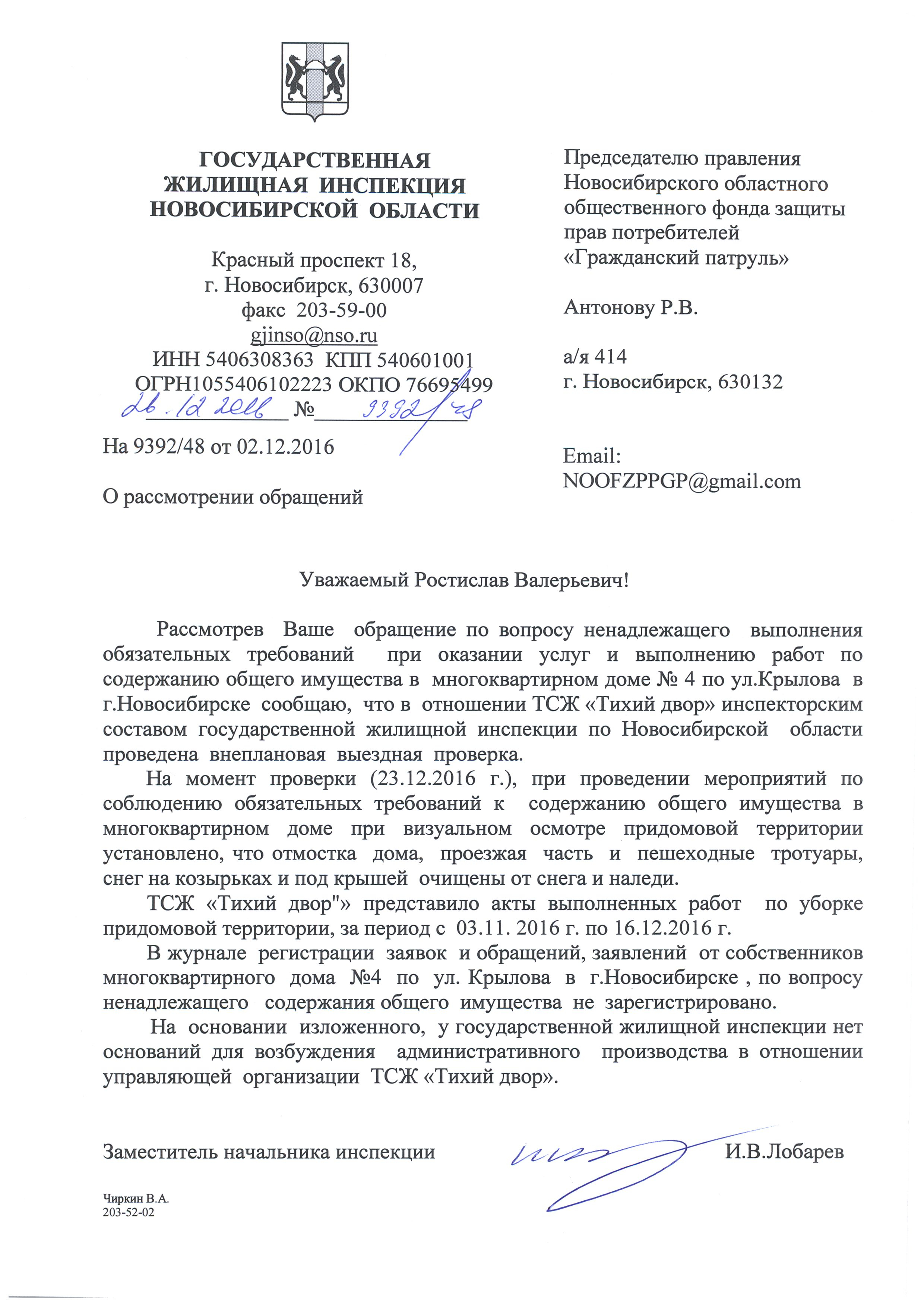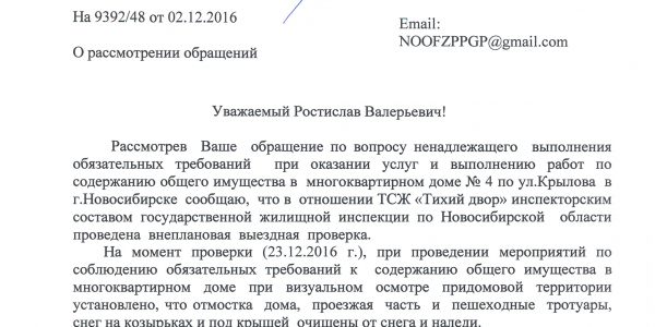 Номер жалобы:11528 Тип жалобы:Качество уборки снега во дворе Название объекта:Управляющая Компания Город:Новосибирск Адрес:Новосибирск, улица Гоголя, 3А Описание жалобы:Придомовая территория толклм не расчищена Статус: