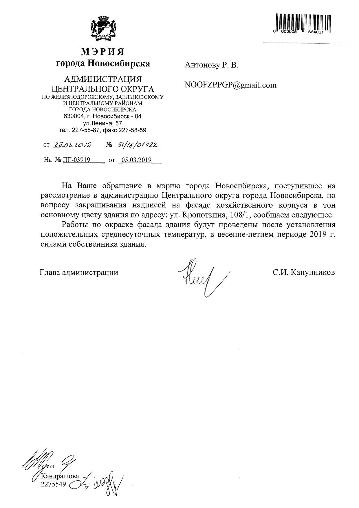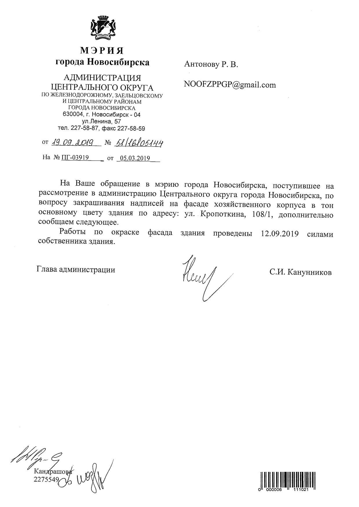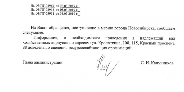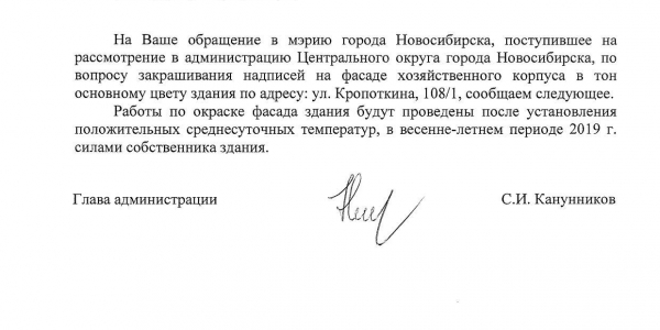 Номер жалобы:50644 Тип жалобы:Иные проблемы ЖКХ Название объекта: Регион:Новосибирская область Город:Новосибирск Адрес:улица Кропоткина, 108/1 Описание жалобы:Надписи на фасаде хозяйственного корпуса закрашены не в тон Статус:
