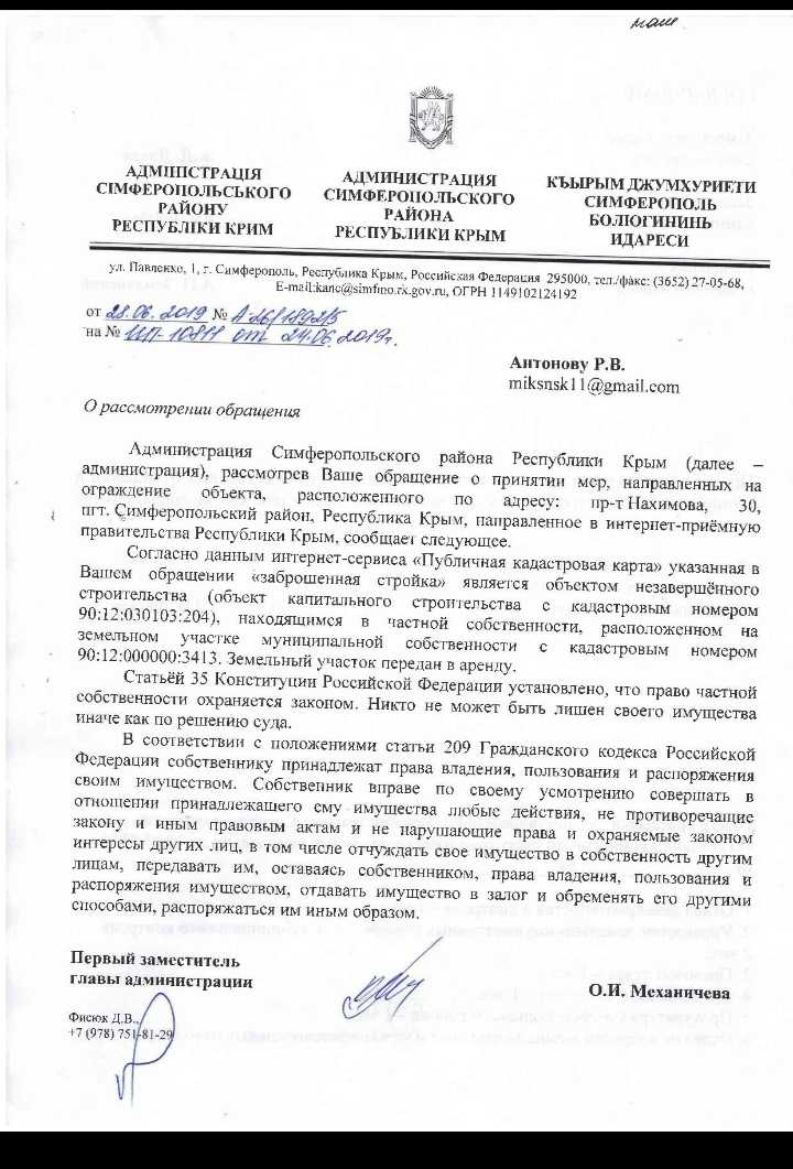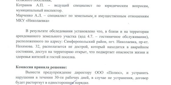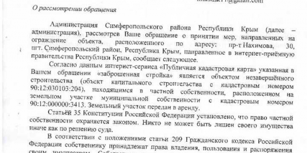 Прошу направить в адрес ГП копию разрешения на строительство по объекту незавершенного строительства, расположенного вблизи адреса: Республика Крым, пгт Николаевка пр. Нахимова д.30( местоположение указано на скрине карты, фотографии стройплощадки прилагаются, точный адрес не установить из публичных карт, прошу дополнительно провести комиссионное обследование территории в рамках муниципального контроля), в связи с уточнением срока действия разрешения и уточнения даты завершения строительства.