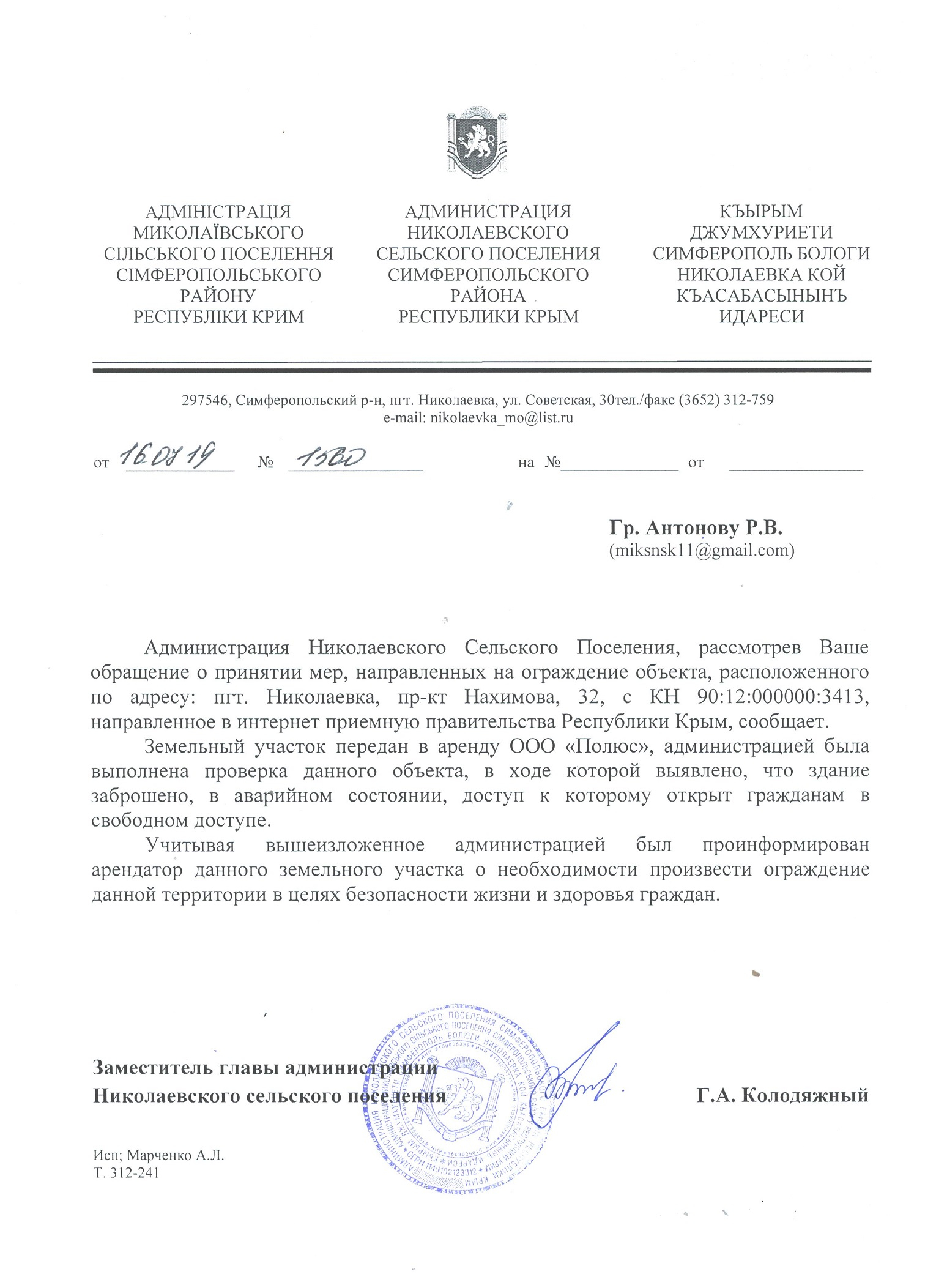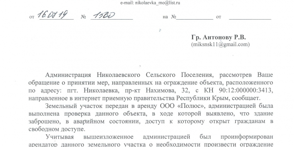 Номер жалобы:57235 Тип жалобы:Прочее Название объекта: Регион:Республика Крым Город:пгт Николаевка Адрес:проспект Нахимова, 32 Описание жалобы:56211, прошу приложить фото от 56211, направить запрос от имени СМИ ГП следующего содержания: