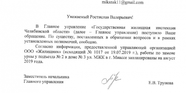 Номер жалобы:57242 Тип жалобы:Прочее Название объекта: Регион:Челябинская область Город:Миасс Адрес:улица МЖК, 3 Описание жалобы:Урны возле подъездов давно пришли в непригодность,но не меняется уже второй год . Статус: