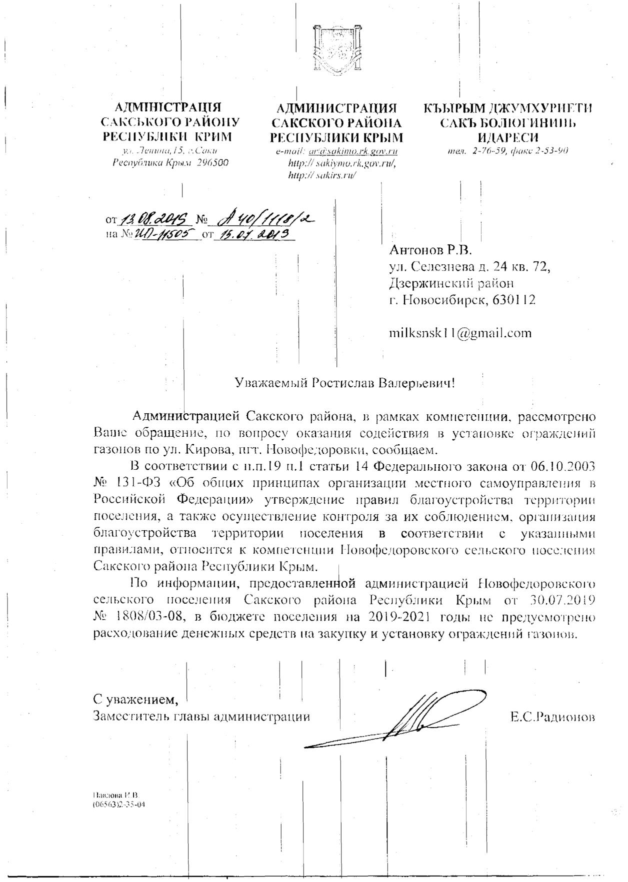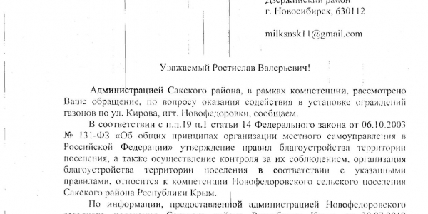 Номер жалобы:57202 Тип жалобы:Прочее Название объекта: Регион:Республика Крым Город:пгт Новофёдоровка Адрес:ул. Кирова Описание жалобы:по всей улице кирова уничтожены газоны из за парковок авто. ларьки на тротуарах. Адсинистрация Нофофедоровки не способна исполнять свои обязанности. Статус: