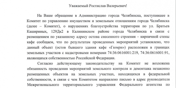 Номер жалобы:57182 Тип жалобы:Прочее Название объекта: Регион:Челябинская область Город:Челябинск Адрес:улица Братьев Кашириных, 129Дк2 Описание жалобы:Непонятное сооружения Статус:
