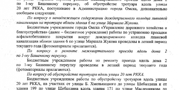 Номер жалобы:57215 Тип жалобы:Прочее Название объекта: Регион:Омская область Город:Омск Адрес:улица 11-я Линия, 183 Описание жалобы:Проезд по участку улицы между улицами Масленникова и 20 лет РККА утонул в воде. Проезд машин затруднён, пешеходы также вынуждены ходить по грязи и лужам. Необходимо провести работы по недопущению подобного в будущем Статус: