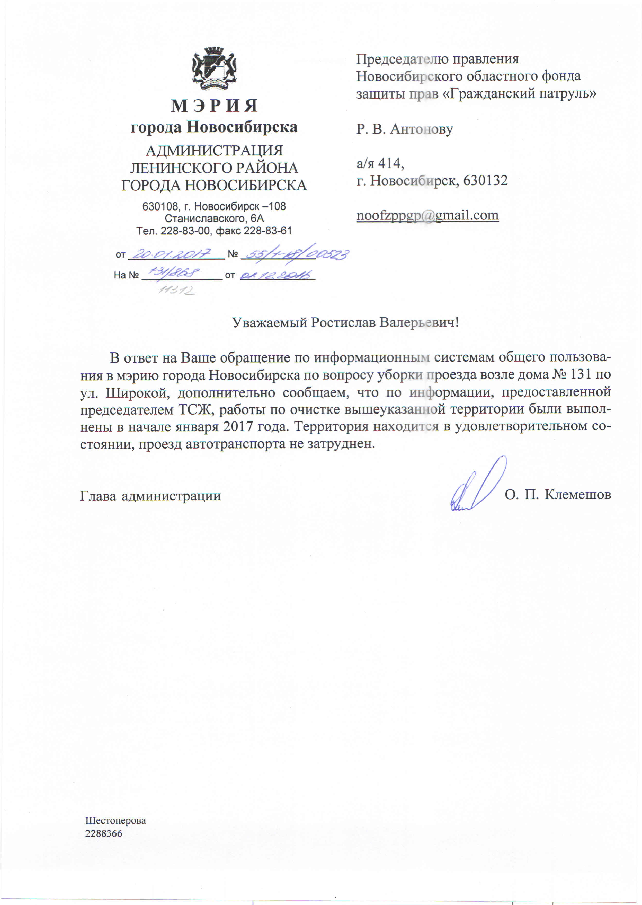 Номер жалобы:11298 Тип жалобы:Качество уборки снега во дворе Название объекта:Управляющая Компания Город:Новосибирск Адрес:Новосибирск, улица Троллейная, 24 Описание жалобы:Снег во дворе Статус: