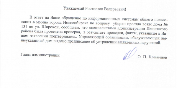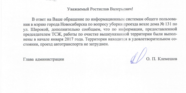 Номер жалобы:11314 Тип жалобы:Качество уборки снега во дворе Название объекта:Управляющая Компания Город:Новосибирск Адрес:Новосибирск, улица Широкая, 135 Описание жалобы:Снег на проезжей части Статус: