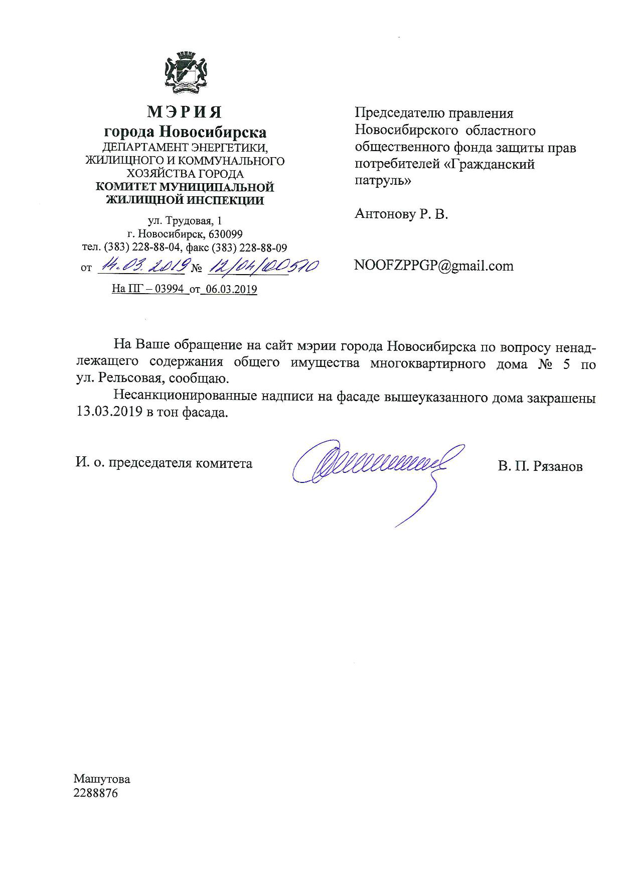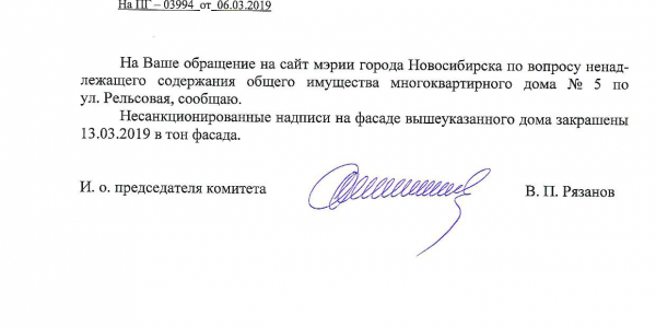 Номер жалобы:50610 Тип жалобы:Иные проблемы ЖКХ Название объекта: Регион:Новосибирская область Город:Новосибирск Адрес:Рельсовая улица, 5 Описание жалобы:Надписи на фасаде дома Статус: