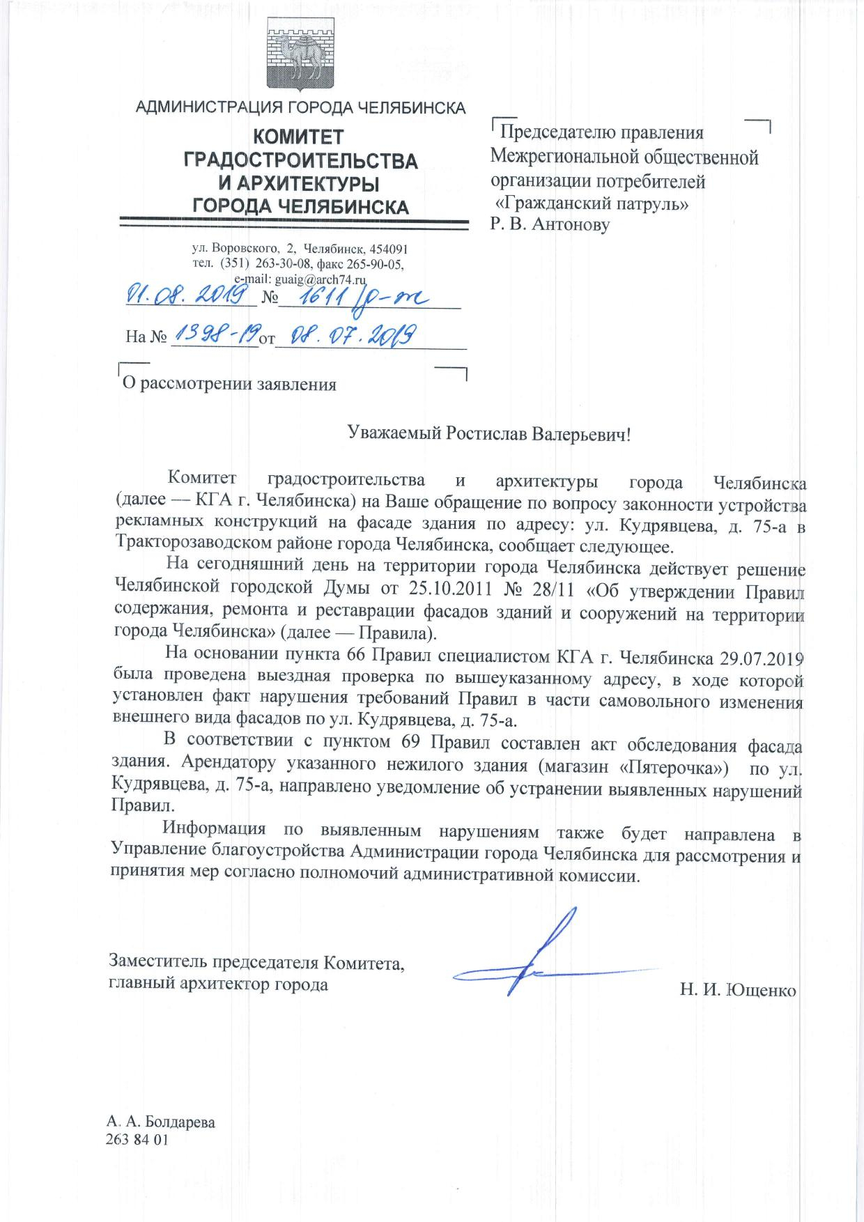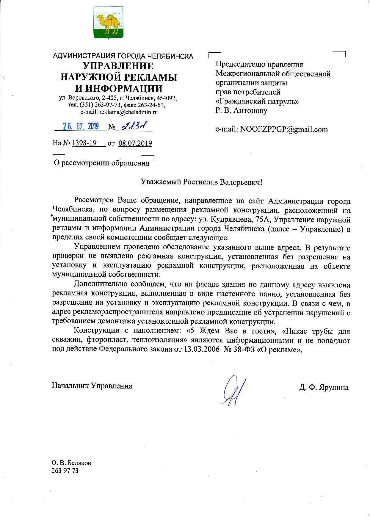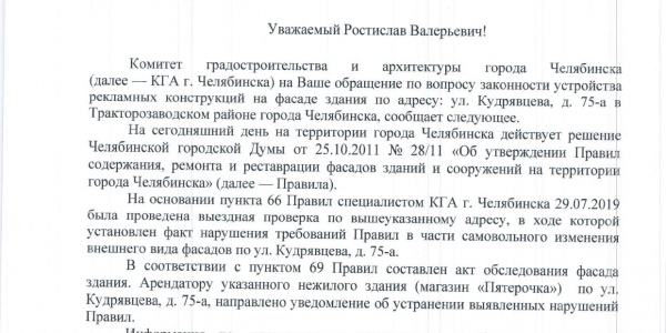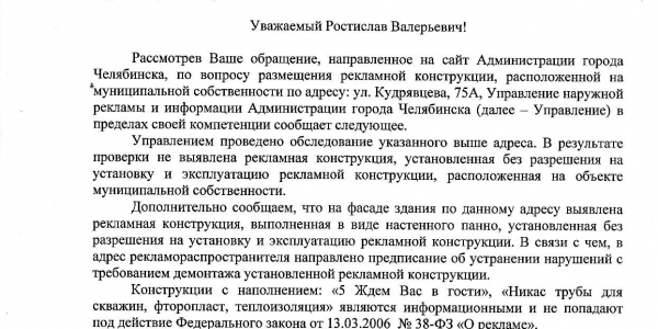 Номер жалобы:57120 Тип жалобы:Прочее Название объекта: Регион:Челябинская область Город:Челябинск Адрес:улица Кудрявцева, 75А Описание жалобы:Законность баннерв, расположенных на окнах здания по Кудрявцева 75 а,. Баннеры принадлежат магазину Пятёрочка и ещё одной компании Статус: