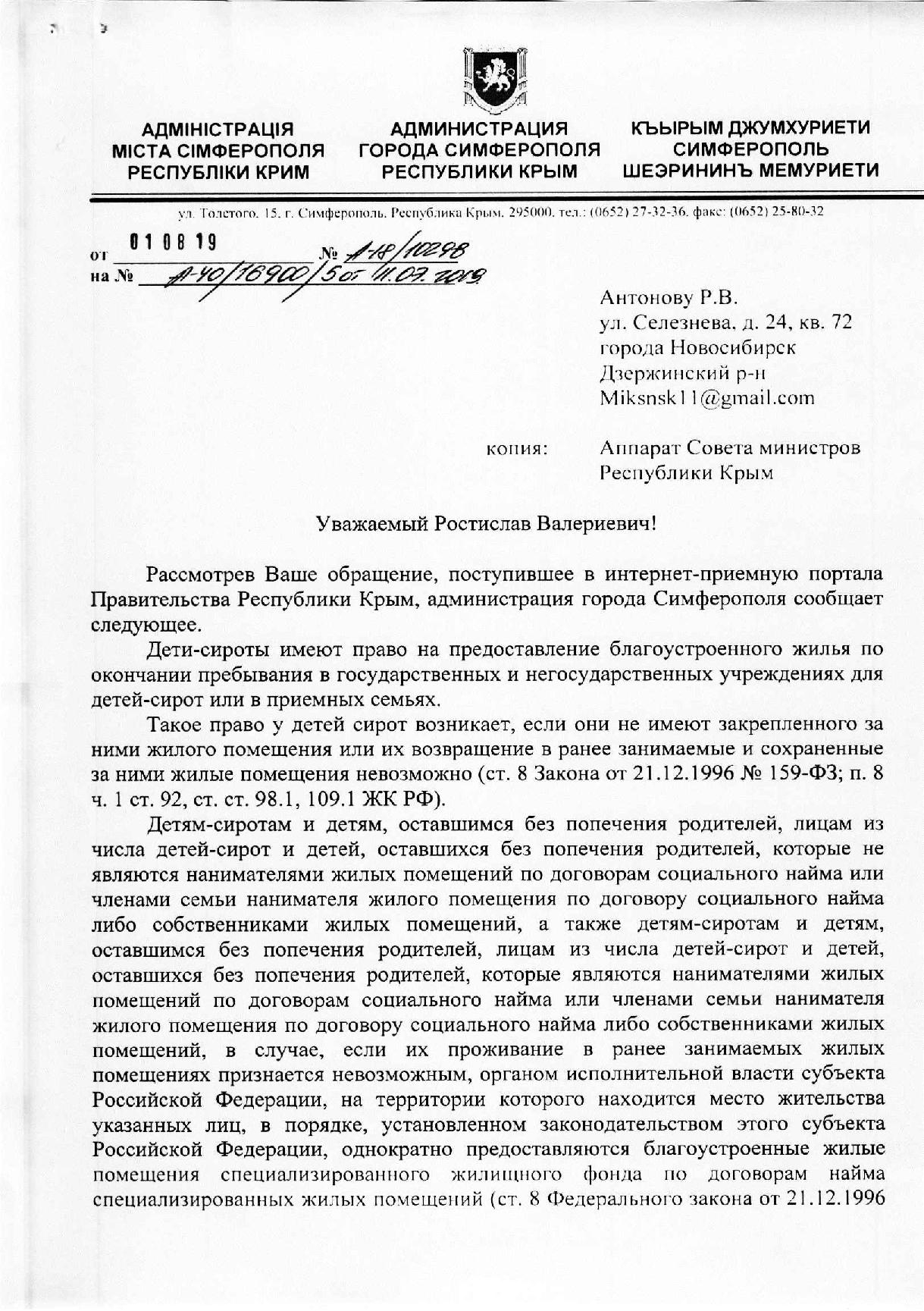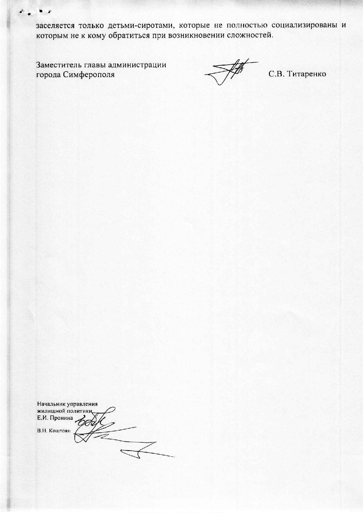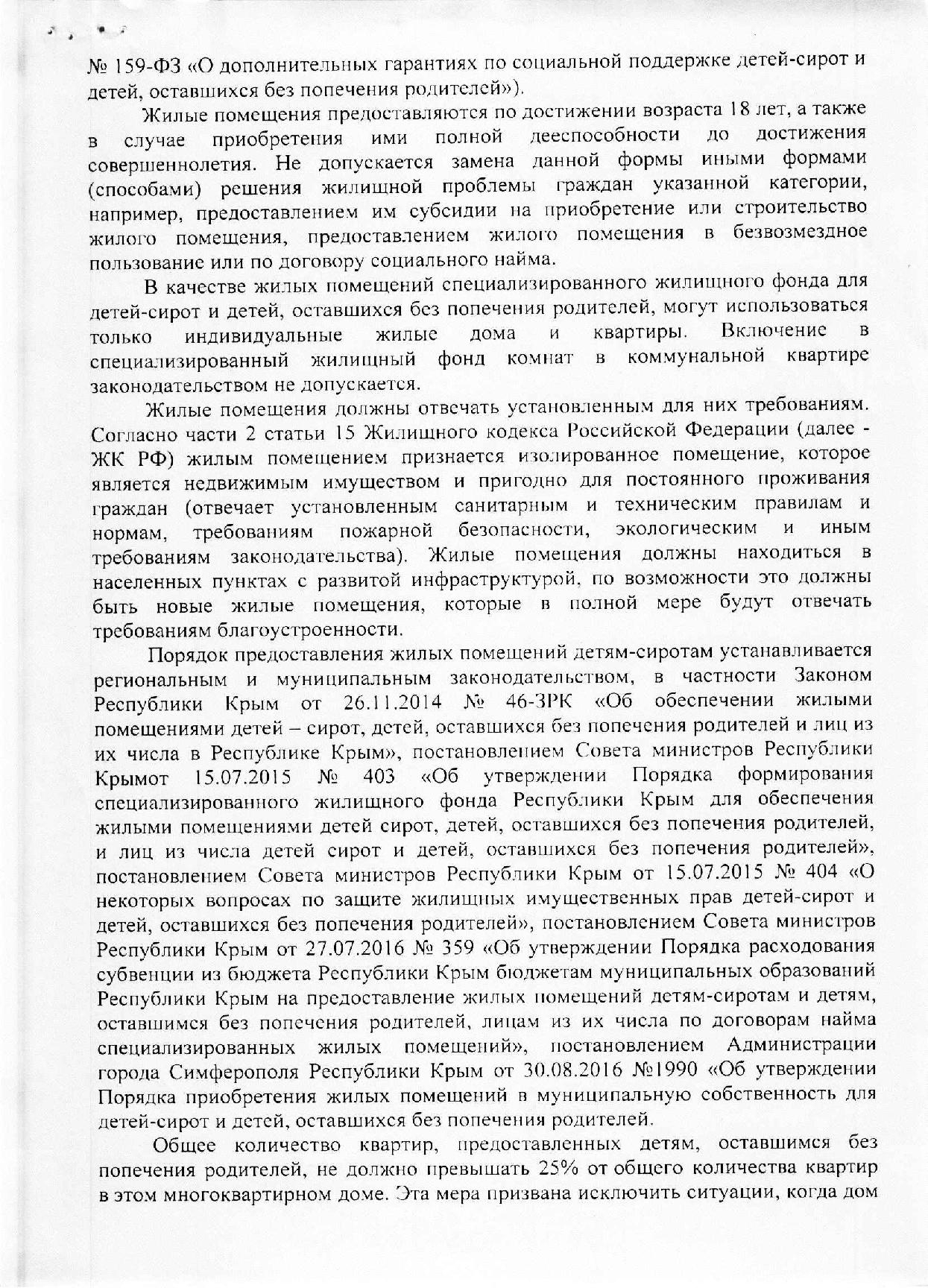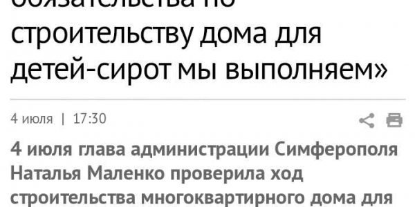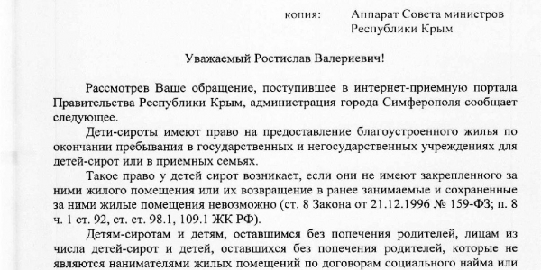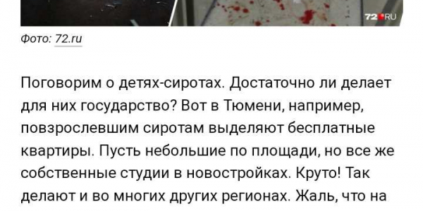 Уважаемая Наталья Федоровна прошу пересмотреть программу строительства домов для детей сирот. Так в г. Симферополь дома строятся на 180 квартир-100 % для детей сирот. После получения квартиры сироты предоставлены сами себе, после 18 лет опекания воспитателями они оказываются на улице, сироты не социализированы и никакой поддержки и помощи от воспитателей не ожидается, следуют лишь наказания в виде статей УК РФ, воспитателем становится наряд ППС, участковый.