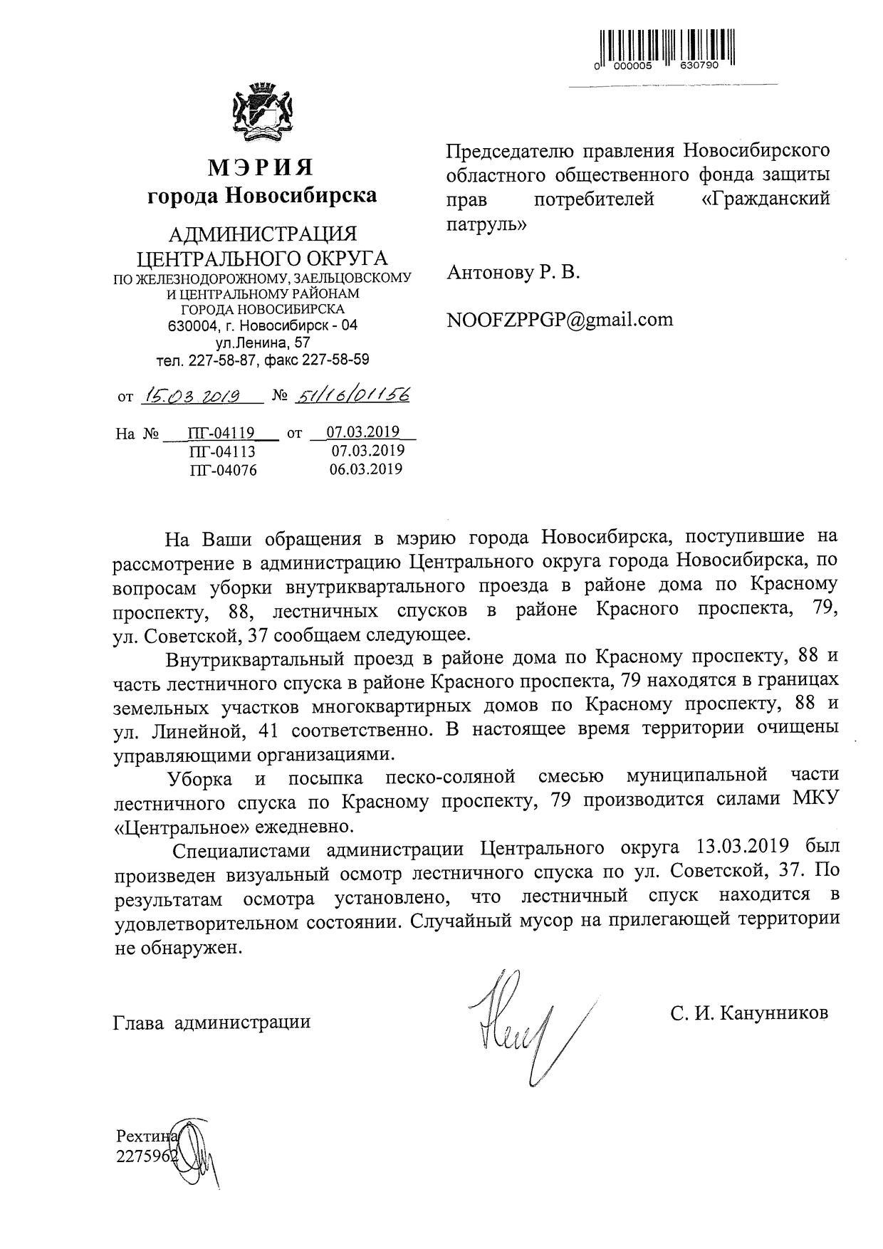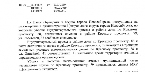 Номер жалобы:50442 Тип жалобы:Иные проблемы ЖКХ Название объекта: Регион:Новосибирская область Город:Новосибирск Адрес:Красный проспект, 79 Описание жалобы:Не расчищена лестница Статус: