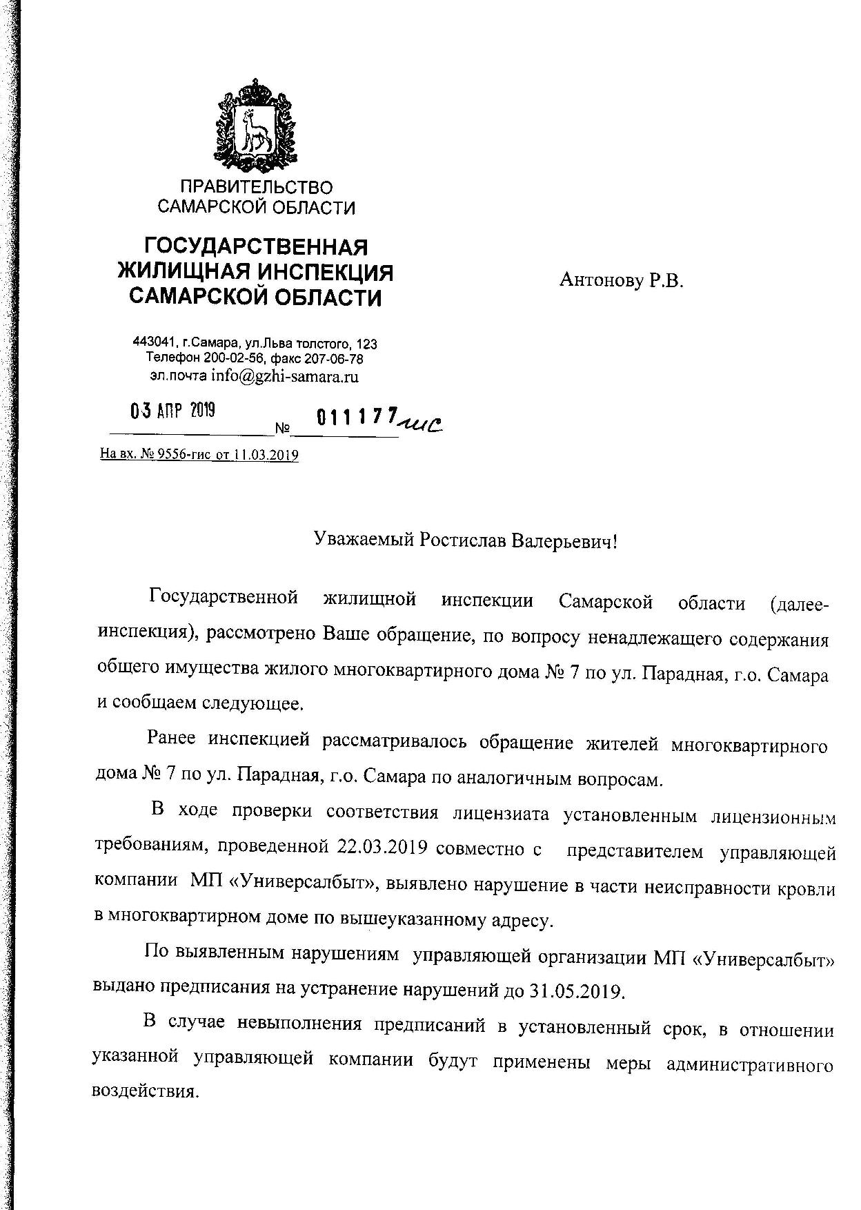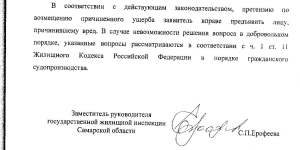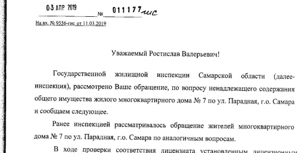 Написано обращение в интернет-приемную губернатора Аароваа Д.И., в ответе от 04.02.19г. Д-9/01899 наше обращение направлено врио руководителя ГЖИ Самарской обл. Катковой В.А., главе г.о.Самара Лапушкиной Е.В.