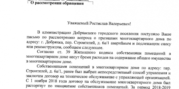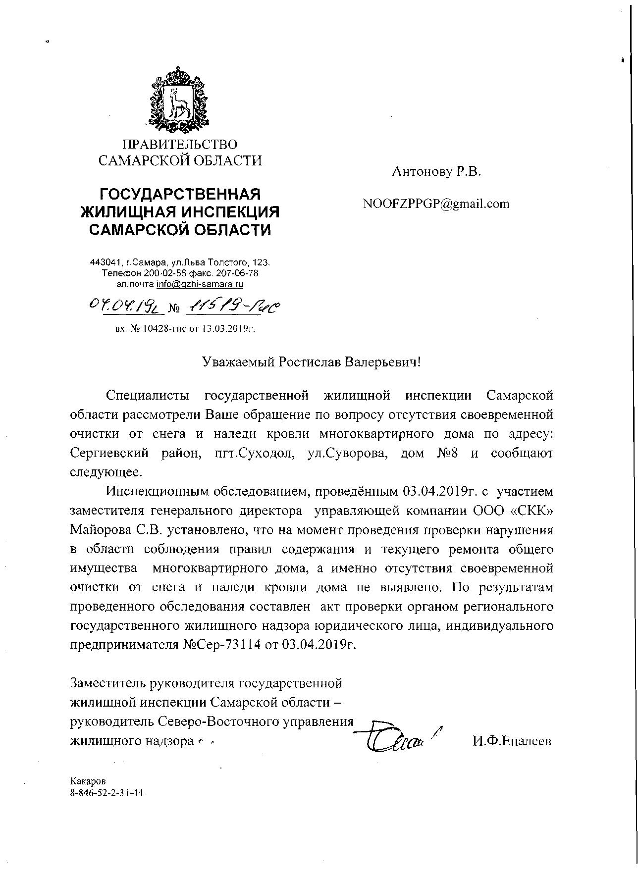 Затем пришел ответ 05.02.19г. 06-09/2865-1190/19/02 от Администрации г.о. Самара, что мое обращение направлено в Администрацию Октябрьского района г.о.Самара. Результата на данный момент нет. Кровля не чищена и течет.