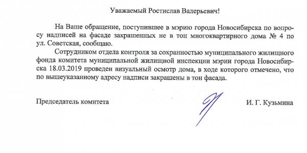 Номер жалобы:50440 Тип жалобы:Иные проблемы ЖКХ Название объекта: Регион:Новосибирская область Город:Новосибирск Адрес:Советская улица, 4 Описание жалобы:Надписи на фасаде дома закрашены не в тон Статус: