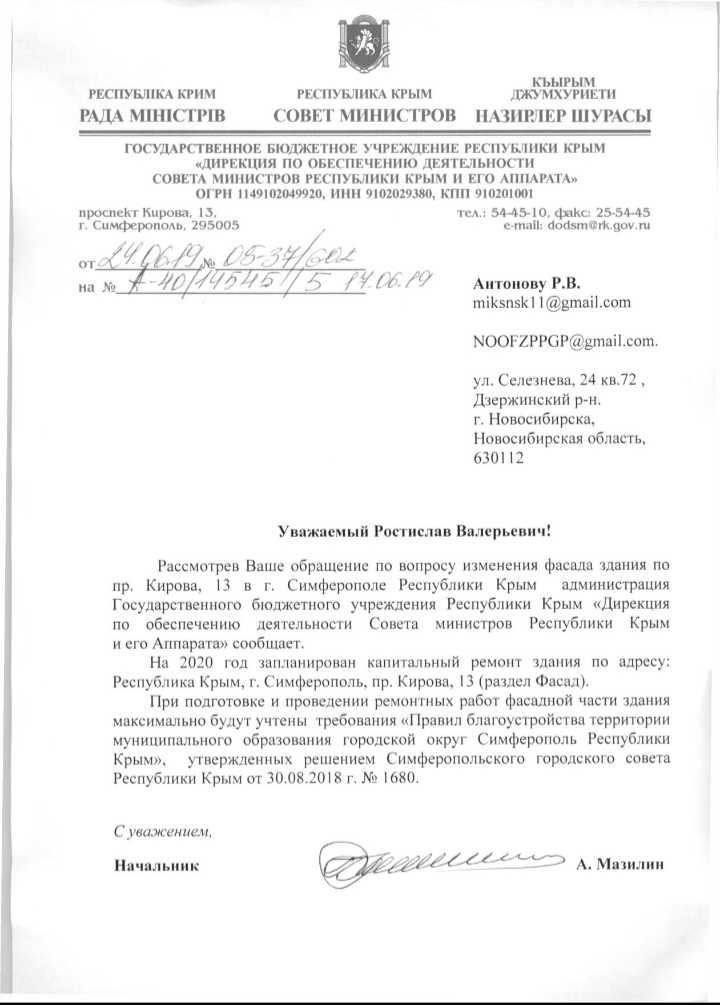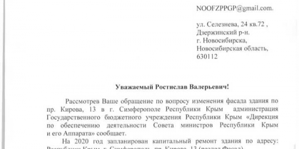 Номер жалобы:57017 Тип жалобы:Прочее Название объекта: Регион:Республика Крым Город:Симферополь Адрес:Симферополь, проспект Кирова, 13 Описание жалобы:54632 В администрацию Симферополя. Прошу выдать предписание на демонтаж кондиционеров по адресу Симферополь Кирова 13. Данные кондиционеры установлены на фасадах исторического здания, в нарушении требований благоустройства Симферополя. Статус: