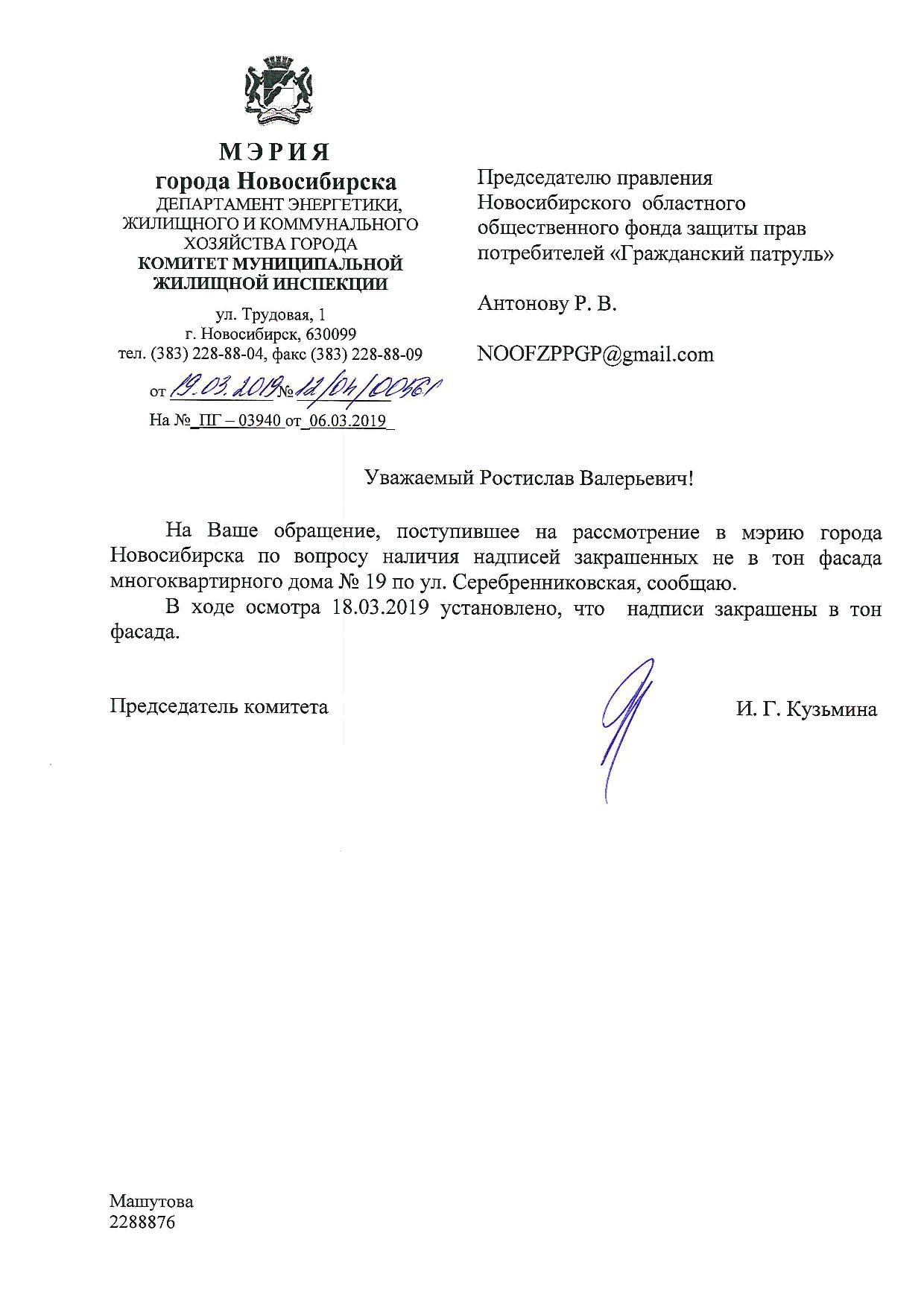 Номер жалобы:50436 Тип жалобы:Иные проблемы ЖКХ Название объекта: Регион:Новосибирская область Город:Новосибирск Адрес:Серебренниковская улица, 19 Описание жалобы:Надписи на фасаде дома закрашены не в тон Статус: