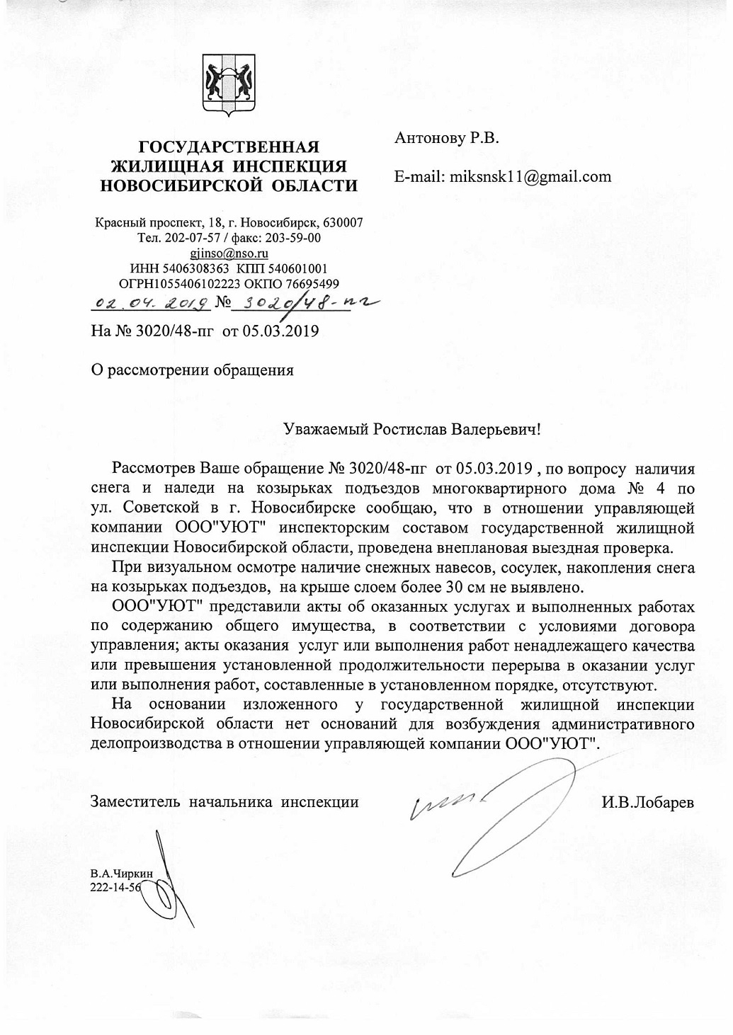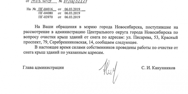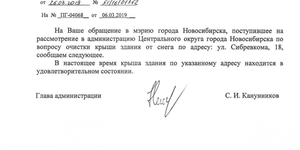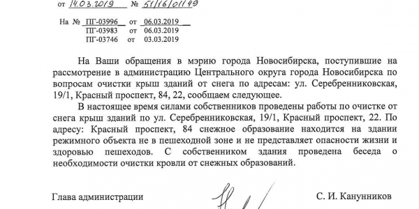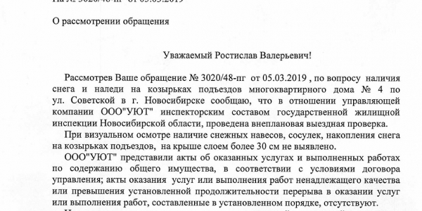 Номер жалобы:50435 Тип жалобы:Иные проблемы ЖКХ Название объекта: Регион:Новосибирская область Город:Новосибирск Адрес:Серебренниковская улица, 19/1 Описание жалобы:Снег на козырьке Статус: