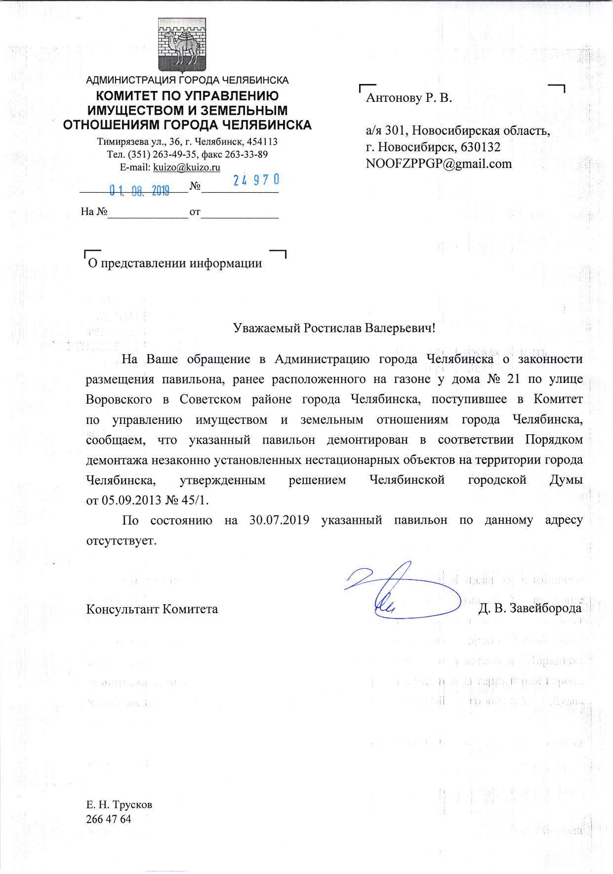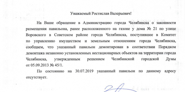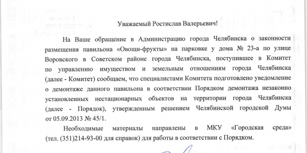 Номер жалобы:56930 Тип жалобы:Прочее Название объекта: Регион:Челябинская область Город:Челябинск Адрес:ул Воровского, 21 Описание жалобы:Прошу проверить законность установки павильона на газоне в сквере напротив Воровского 21 Статус:
