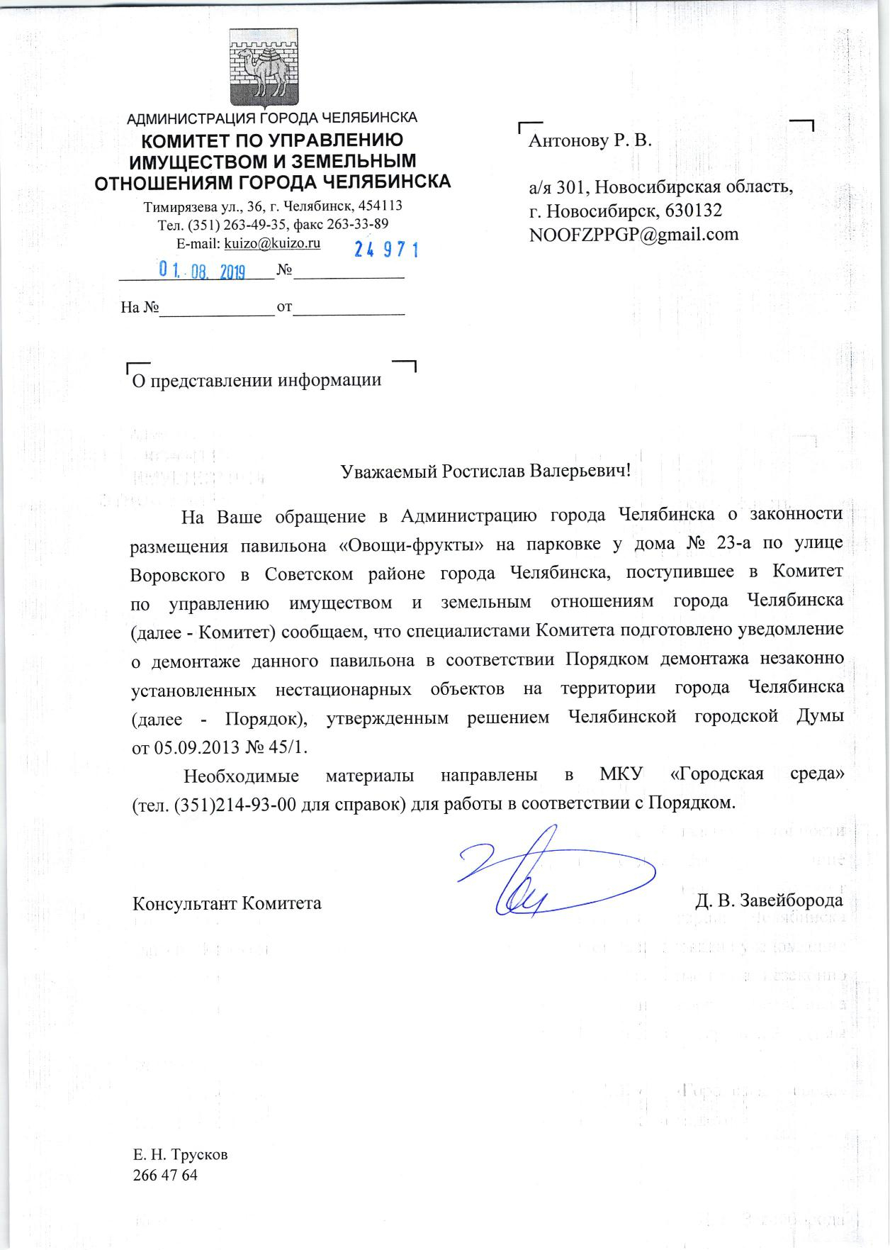Номер жалобы:56931 Тип жалобы:Прочее Название объекта: Регион:Челябинская область Город:Челябинск Адрес:улица Воровского, 23А Описание жалобы:1267-9 Прошу проверить законность установки павильона на парковке Статус: