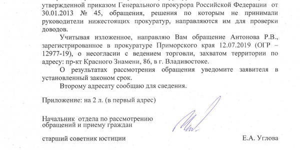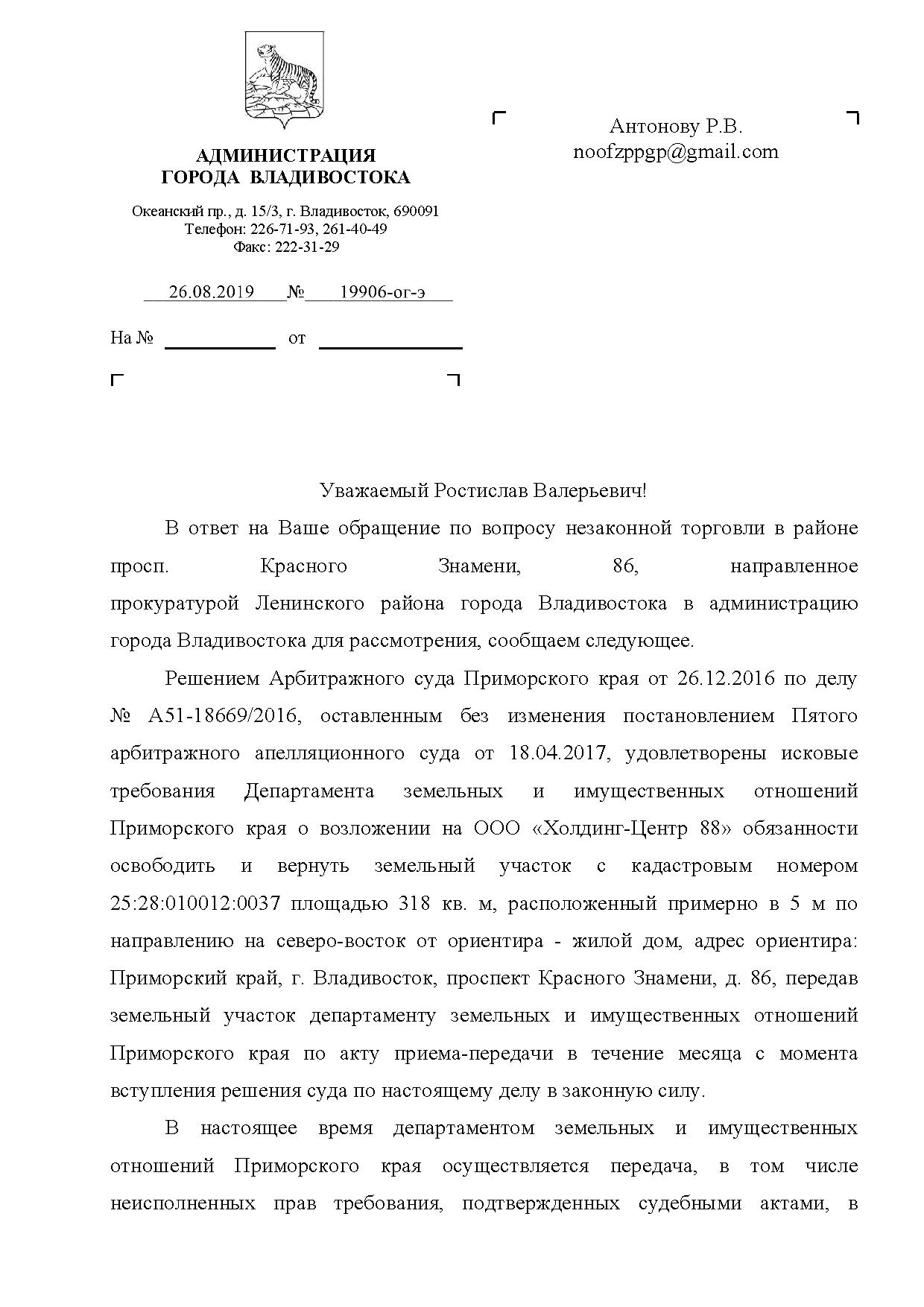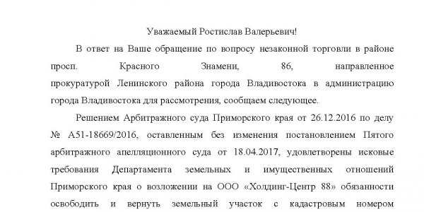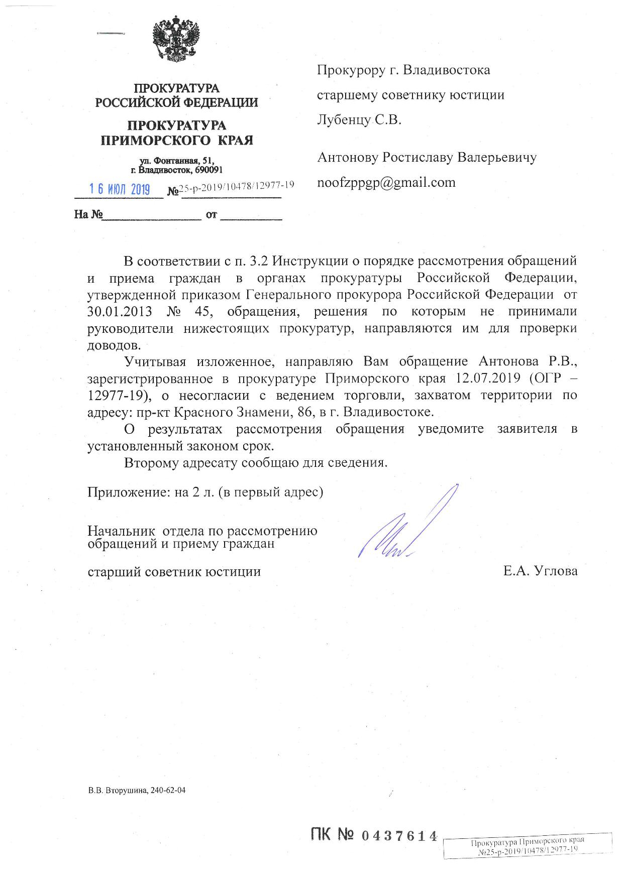 Номер жалобы:56939 Тип жалобы:Прочее Название объекта: Регион:Приморский край Город:Владивосток Адрес:проспект Красного Знамени, 86 Описание жалобы:Незаконная торговля, самовольный захват территории препятствующий проезду автотранспорта и передвижению пешеходов Статус: