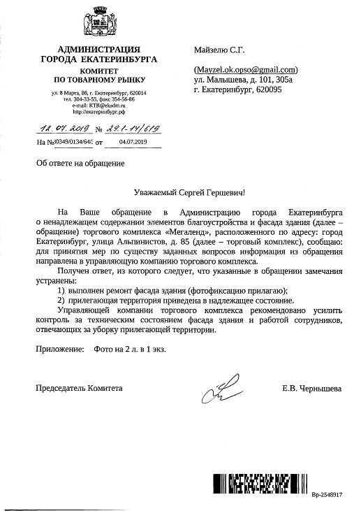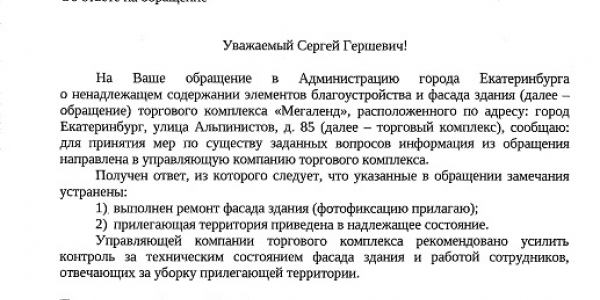 Номер жалобы:56932 Тип жалобы:Прочее Название объекта: Регион:Свердловская область Город:Екатеринбург Адрес:улица Альпинистов, 85 Описание жалобы:ТЦ Мегаленд нарушения по благоустройству: не убирается территория, входная группа ( ступеньки) в неудовлетворительном состояний, что предоставляют опасность покупателям, фасад задания тоже предоставляет опасность плитка выпадает что может упасть на машины или людей. Статус: