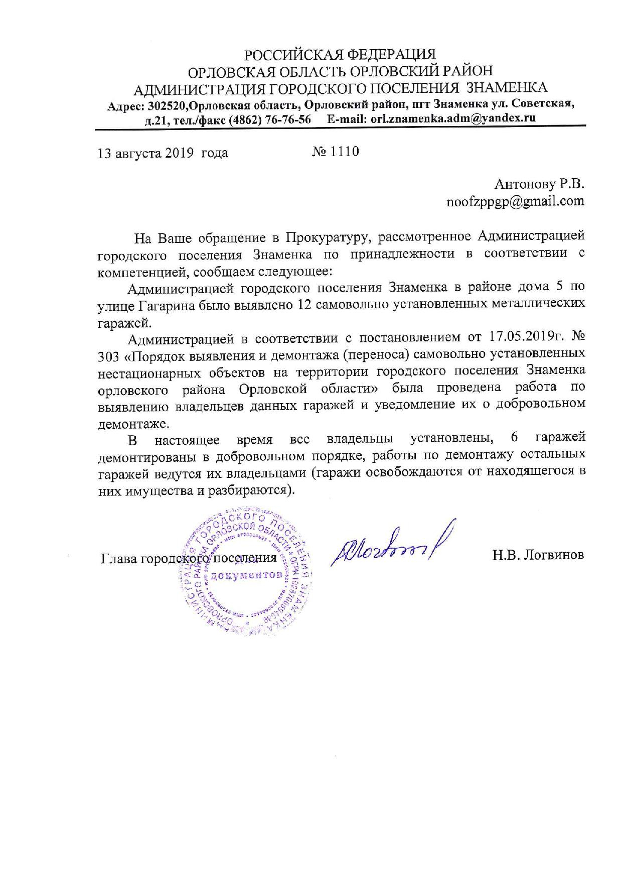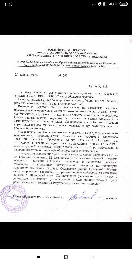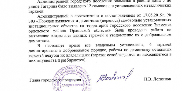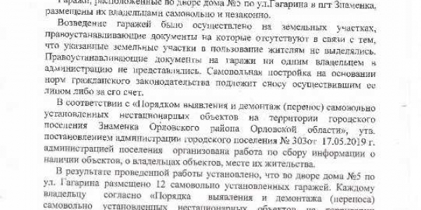 Номер жалобы:56828 Тип жалобы:Прочее Название объекта: Регион:Орловская область Город:посёлок городского типа Знаменка Адрес:улица Гагарина, 5 Описание жалобы:Здравствуйте, ранее была подана жалоба на незаконные гаражи во дворе жилого дома . Был получен ответ и выписаны постановления убрать гаражи . Но как видно на фото , не все владельцы гаражей хотят жить по закону и по совести . Из 12 гаражей , убрали только 5 . И то с одного конца дома . Остальные не хотят добровольно убирать свои незаконные постройки . В добавок ко всему , жители частного дома , сделали выезд со своей территории , через территорию двора , и расширили свою территорию , отхватив часть территории двора многоквартирного дома . Статус:
