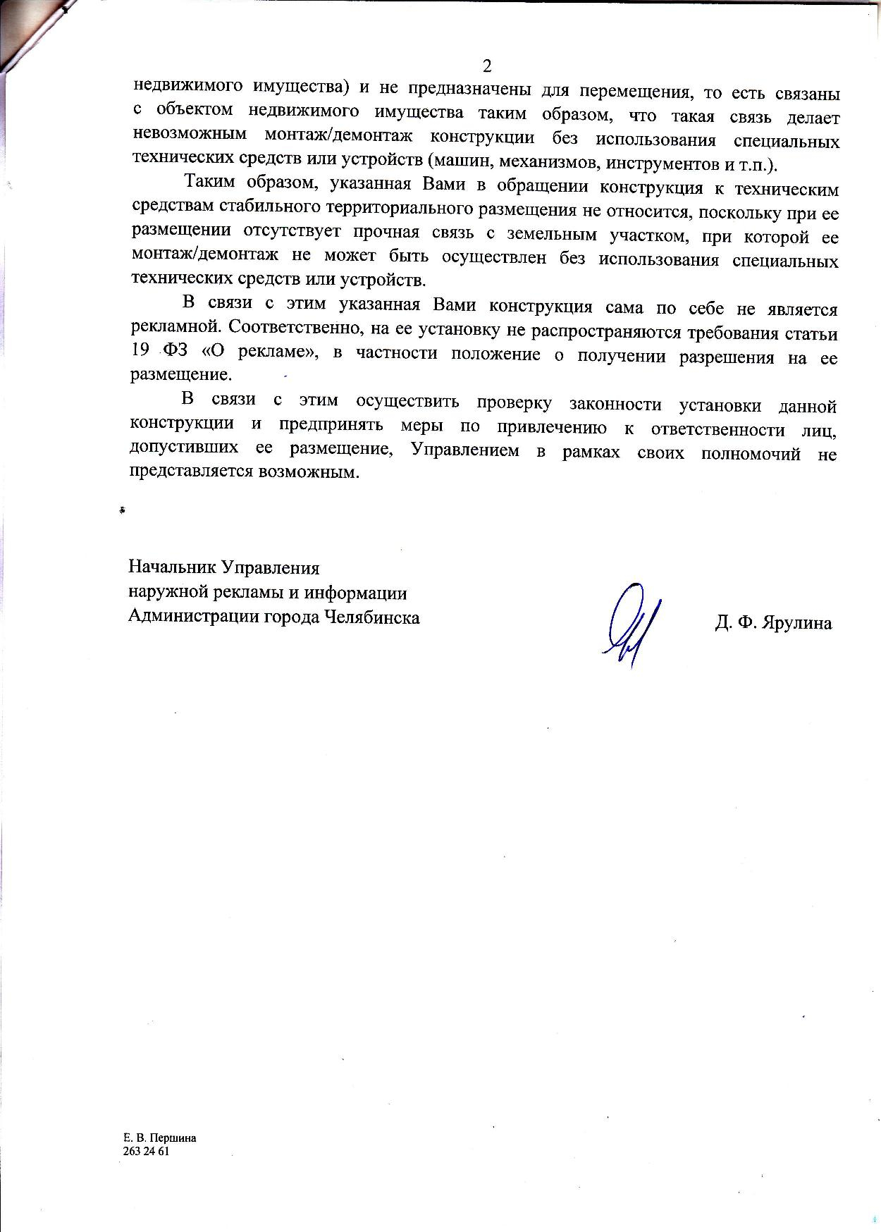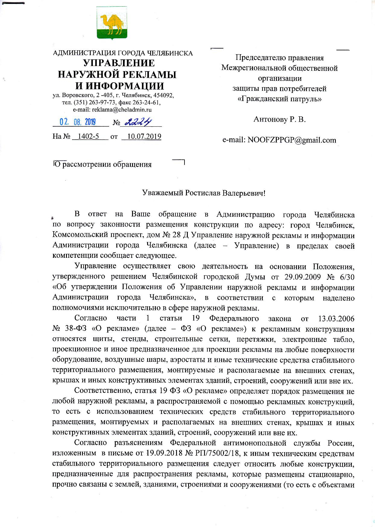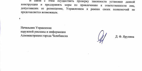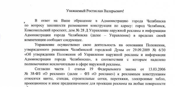 Номер жалобы:56829 Тип жалобы:Прочее Название объекта: Регион:Челябинская область Город:Челябинск Адрес:Комсомольский проспект, 28Д Описание жалобы:На перекрестке улицы Красного Урала и Комсомольского проспекта ВНОВЬ устанавливают рекламную конструкцию таким образом, что полностью перекрывают обзор водителям, поворачивающим направо с Красного Урала. Статус: