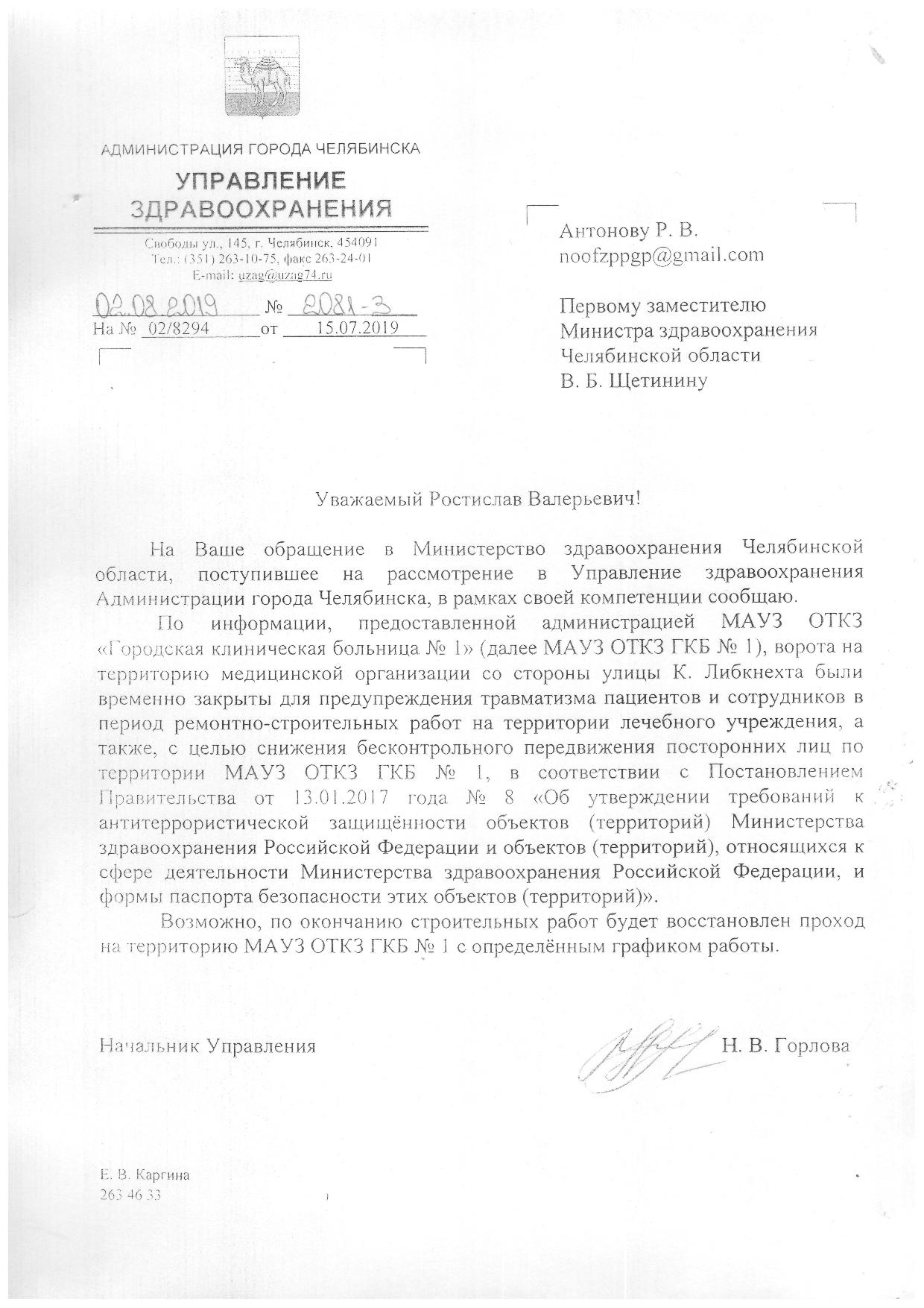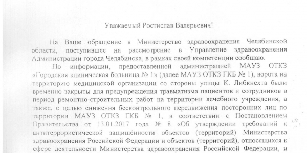 Номер жалобы:56836 Тип жалобы:Прочее Название объекта: Регион:Челябинская область Город:Челябинск Адрес:улица Воровского, 16к3 Описание жалобы:Требуется обязать Городскую больницу #1 открыть вход со стороны К. Либкнехта, закрытый на время строительных работ.