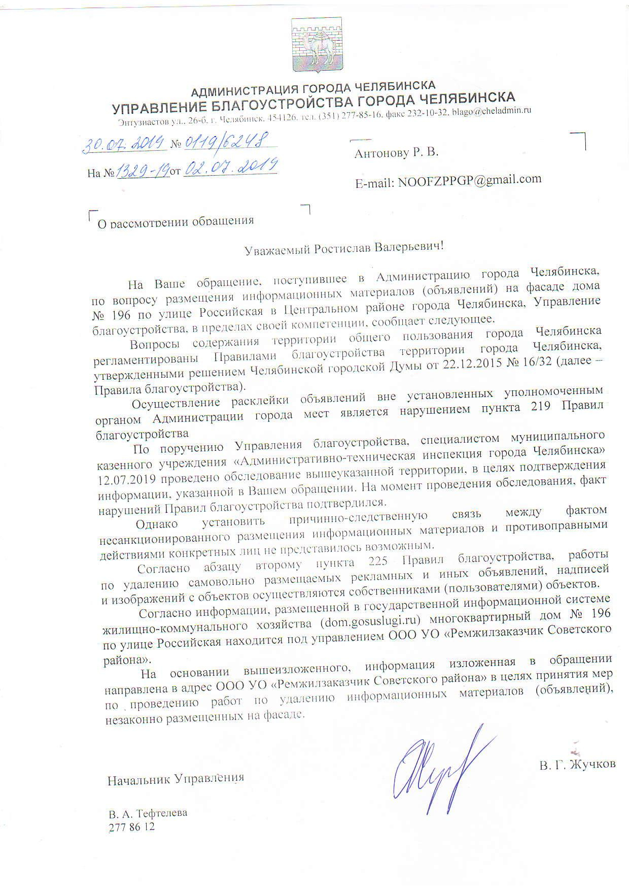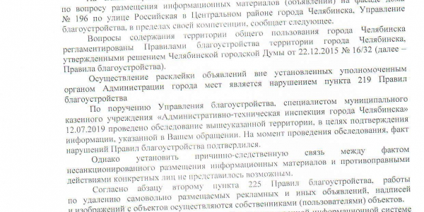Номер жалобы:56838 Тип жалобы:Прочее Название объекта: Регион:Челябинская область Город:Челябинск Адрес:Российская улица, 196 Описание жалобы:Просьба очистить от рекламных объявлений и вывесок фасад здания по ул. Российской 196, г. Челябинска Статус: