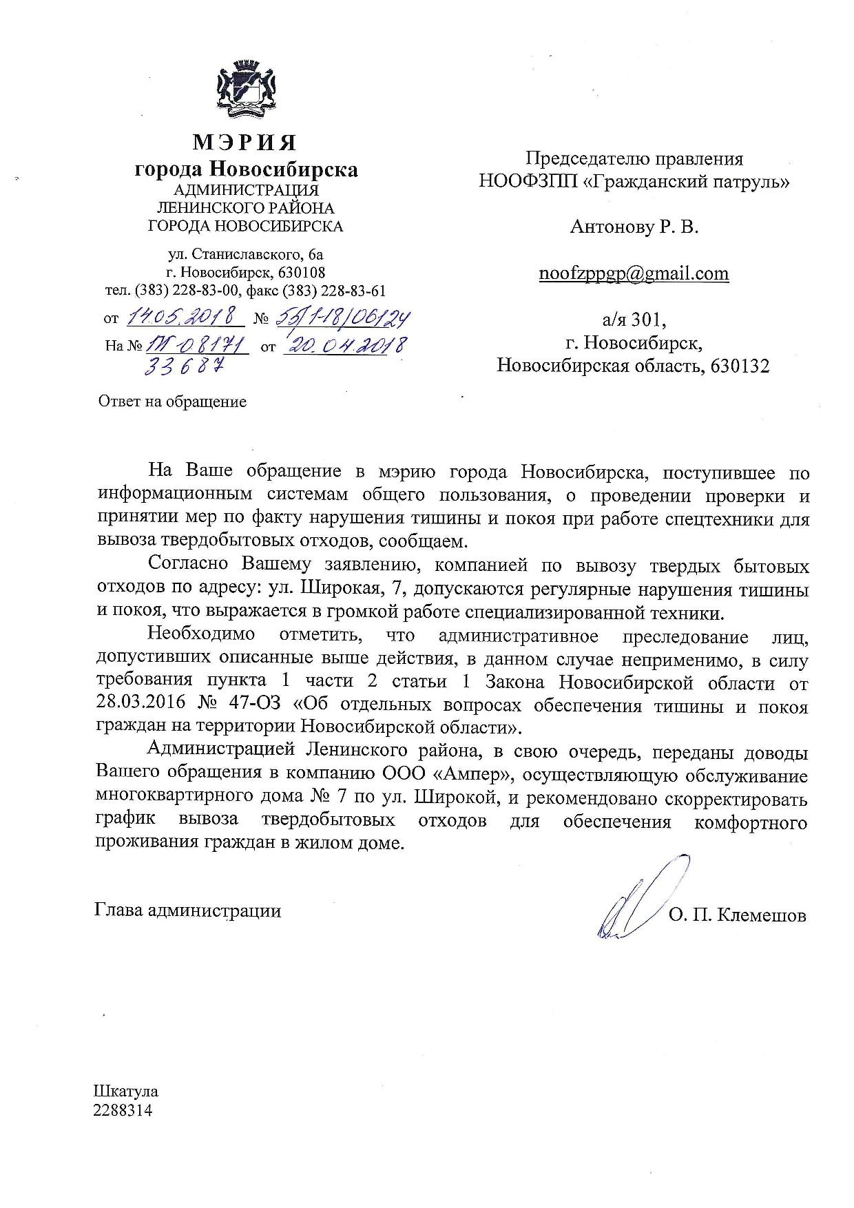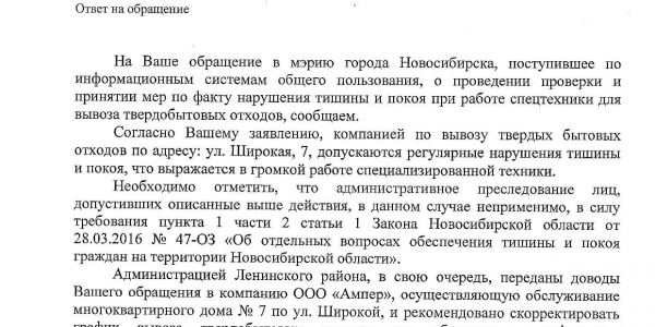 Номер жалобы:33687 Тип жалобы:Нарушение тишины Название объекта:ЖКХ Ампер Регион:Новосибирская область Город:Новосибирск Адрес:ул. Котовского, 30 Описание жалобы:Добрый день. Прошу вашей помощи по устранению ненормированного графика вывоза мусора по адресу Широкая 7 (почему то на карте нет выбора именно этого дома, поэтому выбрала ближейший). В будний день это после 07:30, а в выходной как ни странно в 04:17. Мусорные баки расположены очень близко к дому и такой ранний приезд нарушает режим сна. Заранее спасибо. Статус: