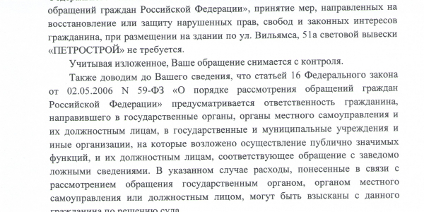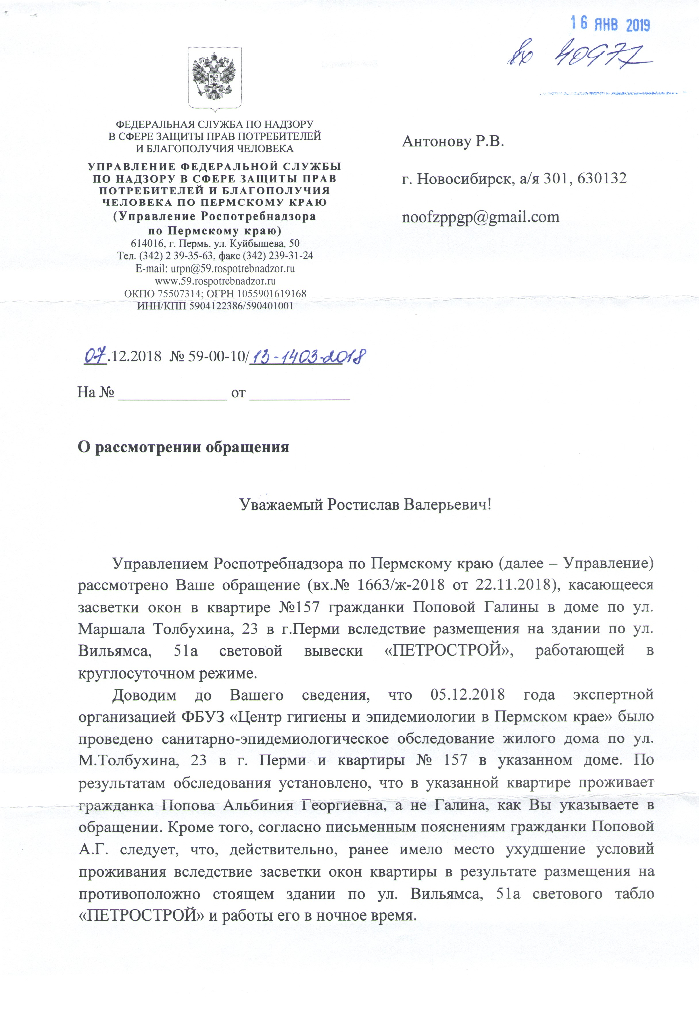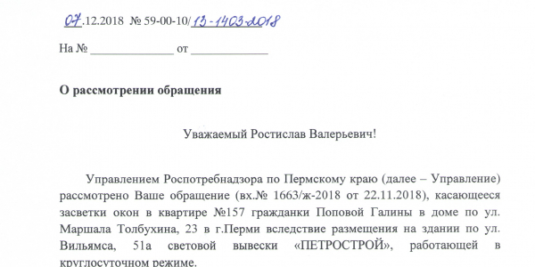 Номер жалобы:40977 Тип жалобы:Нарушение тишины Название объекта:Петрострой Регион:Пермский край Город:Пермь Адрес:улица Маршала Толбухина, 23 Описание жалобы:Не выключают свою надпись,очень мешает спать ,светит в окна ,приходится завешивать все именно темными шторами,через светлые невозможно спать. Раньше выключали ее в 00ч,сейчас днём выключают,под ночь снова она освещает все вокруг. Вильямса 51а