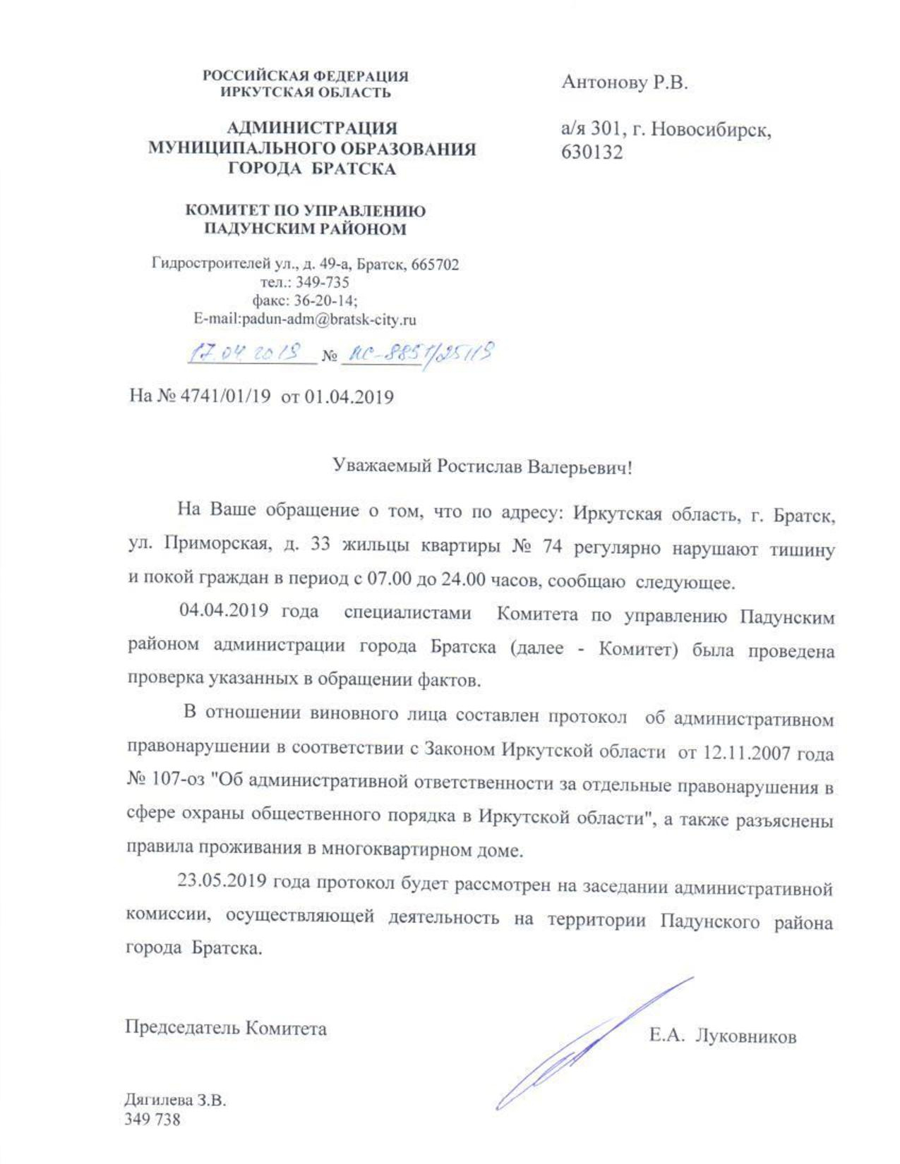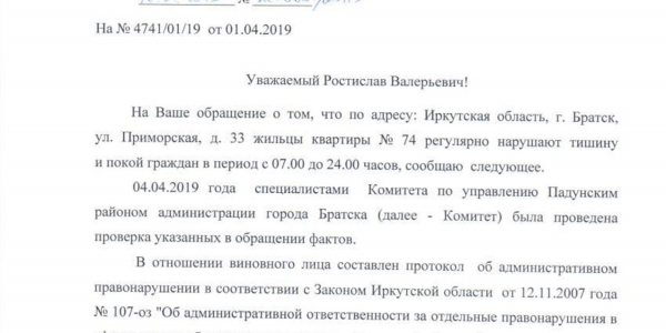 Номер жалобы:52321 Тип жалобы:Нарушение тишины Название объекта: Регион:Иркутская область Город:Братск Адрес:Приморская улица, 33 Описание жалобы:По адресу г. Братск ул. Приморская д. 33 кв 74 соседи регулярно нарушают тишину, скачут дети начиная с 7 утра заканчивая 12 ночи (Так что у меня в квартире сотрясаются полы и стекла), взрослые кричат очень громко друг на друга. Один раз вызывала полицию (Это было примерно в 3 часа ночи), так же поднималась к ним с просьбой вести себя тише, после этого ситуация не поменялась.