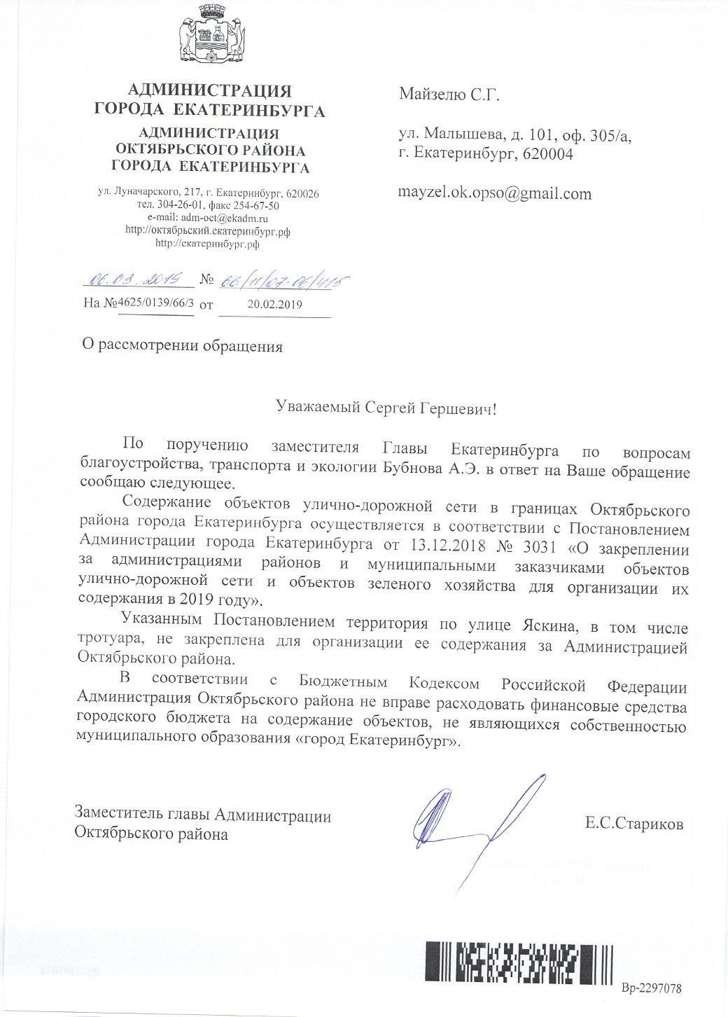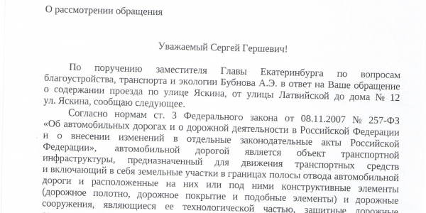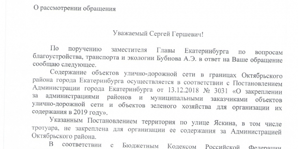 Номер жалобы:49631 Тип жалобы:Качество уборки снега на тротуарах Название объекта:Мэрия Регион:Свердловская область Город:Екатеринбург Адрес:улица Яскина, 8 Описание жалобы:На всём протяжении улицы Яскина (от улицы Латвийской до дома 12 по улице Яскина) отсутствует уборка снега на тротуарах и проезжей части. Статус: