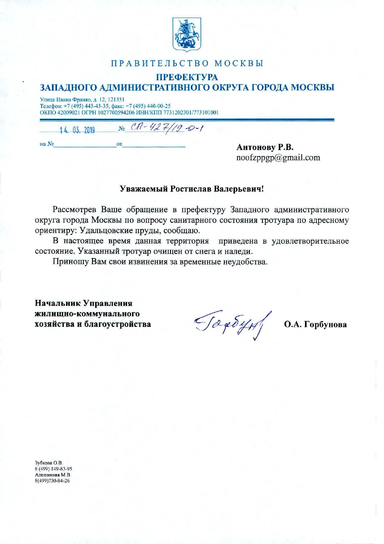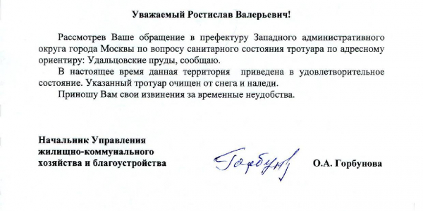 Номер жалобы:50187 Тип жалобы:Качество уборки снега на тротуарах Название объекта: Регион:Москва Город:Москва Адрес:улица Удальцова, 8 Описание жалобы:Дорожки вокруг Удальцовских прудов перестали убирать. Ожидаемо появилась наледь. Статус: Вложенные файлы: