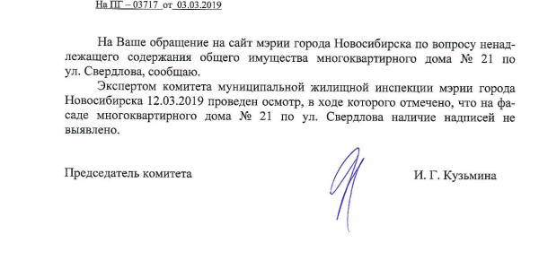 Номер жалобы:50357 Тип жалобы:Иные проблемы ЖКХ Название объекта: Регион:Новосибирская область Город:Новосибирск Адрес:улица Свердлова, 21 Описание жалобы:Надписи на фасаде дома Статус: