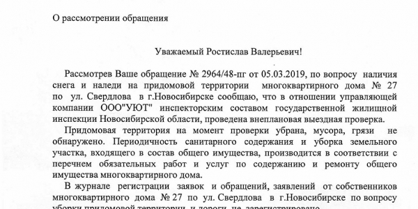 Номер жалобы:50360 Тип жалобы:Иные проблемы ЖКХ Название объекта: Регион:Новосибирская область Город:Новосибирск Адрес:улица Свердлова, 27 Описание жалобы:ООО "УЮТ"