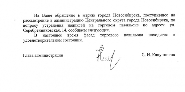 Номер жалобы:50365 Тип жалобы:Иные проблемы ЖКХ Название объекта: Регион:Новосибирская область Город:Новосибирск Адрес:Серебренниковская улица, 14 Описание жалобы:Надписи на киоске Статус: