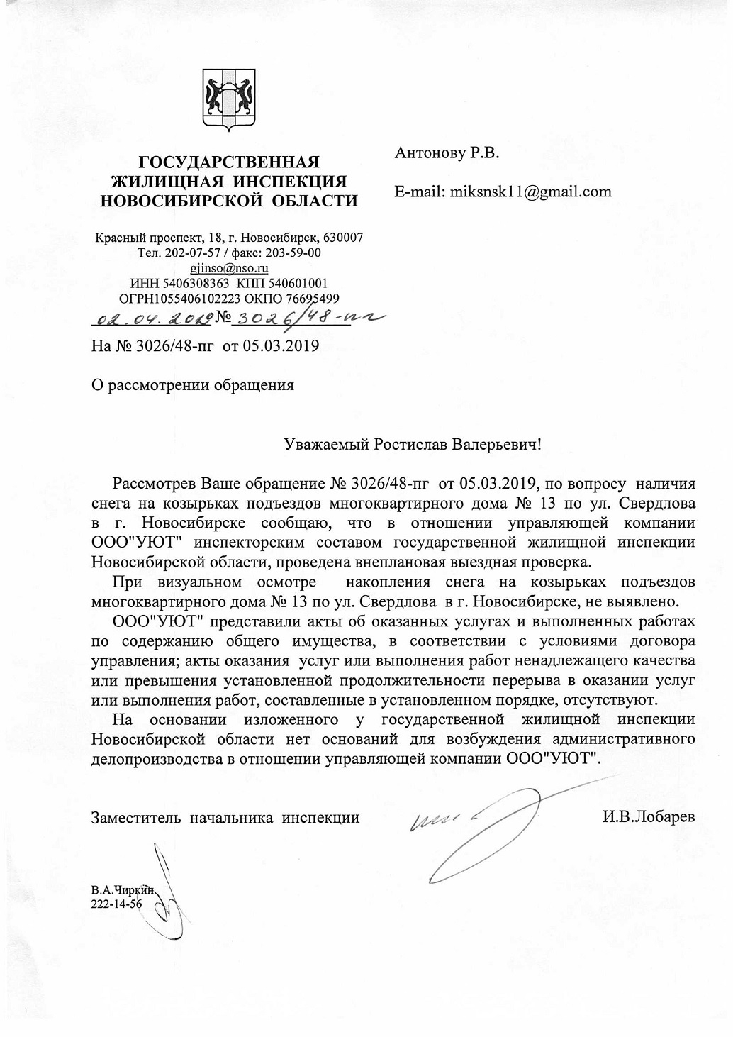 Номер жалобы:50353 Тип жалобы:Иные проблемы ЖКХ Название объекта: Регион:Новосибирская область Город:Новосибирск Адрес:улица Свердлова, 13 Описание жалобы:ООО "УЮТ"
