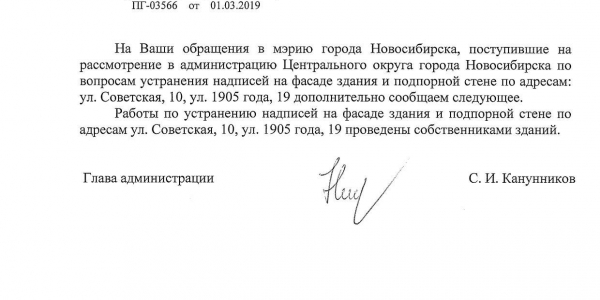 Номер жалобы:50346 Тип жалобы:Иные проблемы ЖКХ Название объекта: Регион:Новосибирская область Город:Новосибирск Адрес:Советская улица, 10 Описание жалобы:Надписи на фасаде дома Статус: