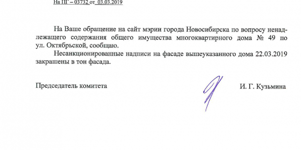 Номер жалобы:50342 Тип жалобы:Иные проблемы ЖКХ Название объекта: Регион:Новосибирская область Город:Новосибирск Адрес:Октябрьская улица, 49 Описание жалобы:Надписи на фасаде дома Статус: