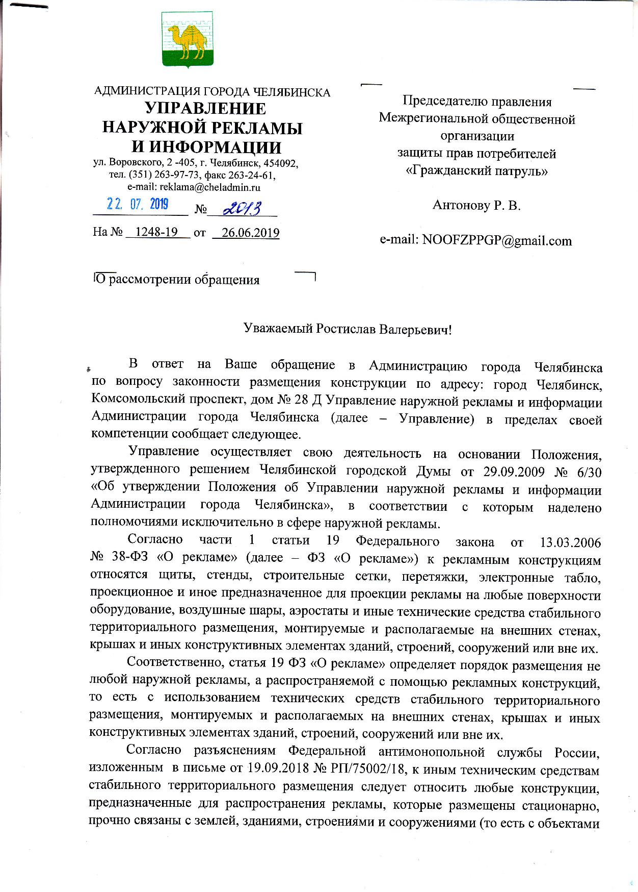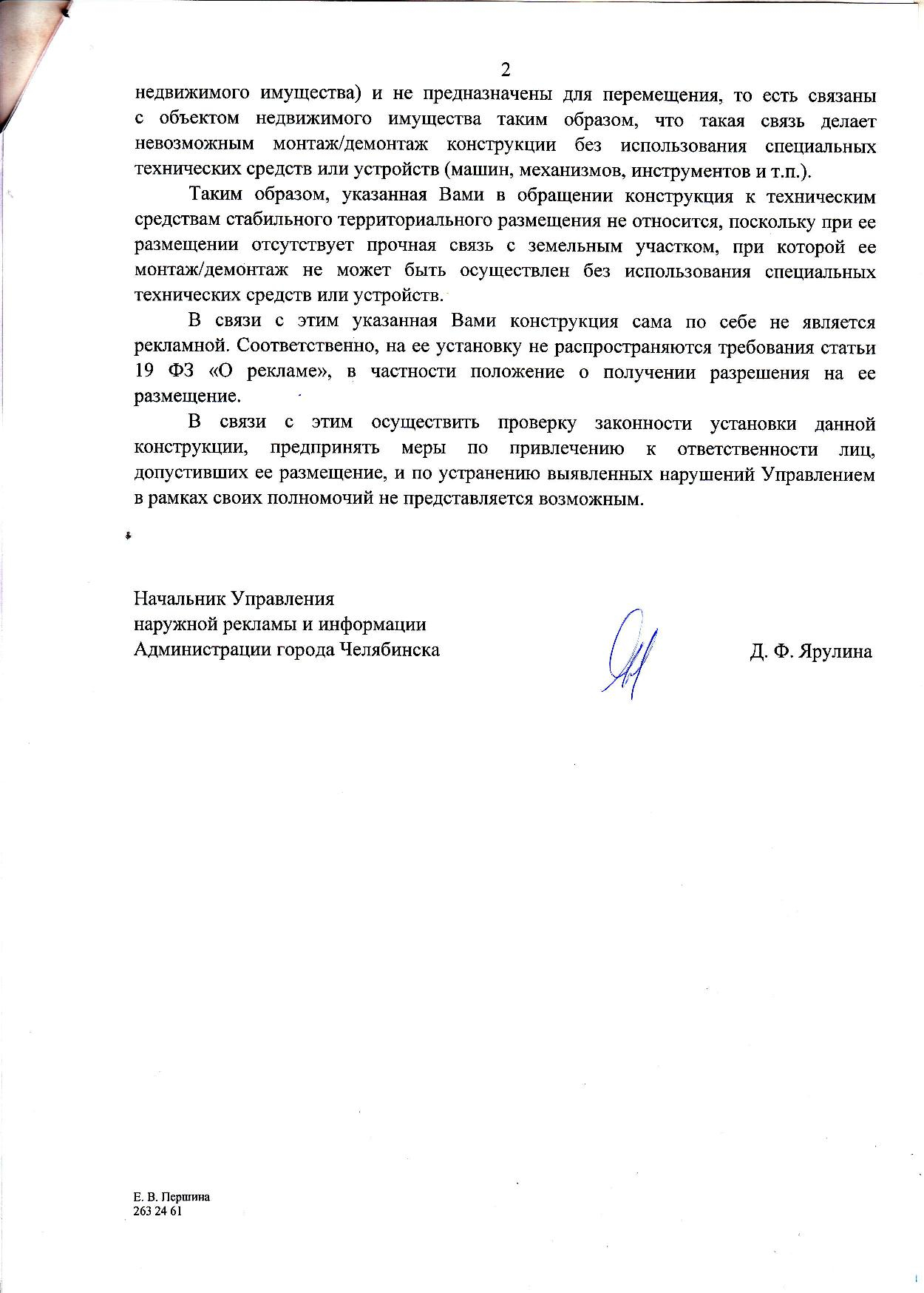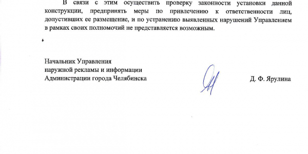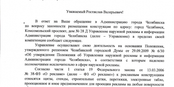 Номер жалобы:56579 Тип жалобы:Прочее Название объекта: Регион:Челябинская область Город:Челябинск Адрес:Комсомольский проспект, 28Д Описание жалобы:Законно ли размещение рекламы на перекрестке? Статус: