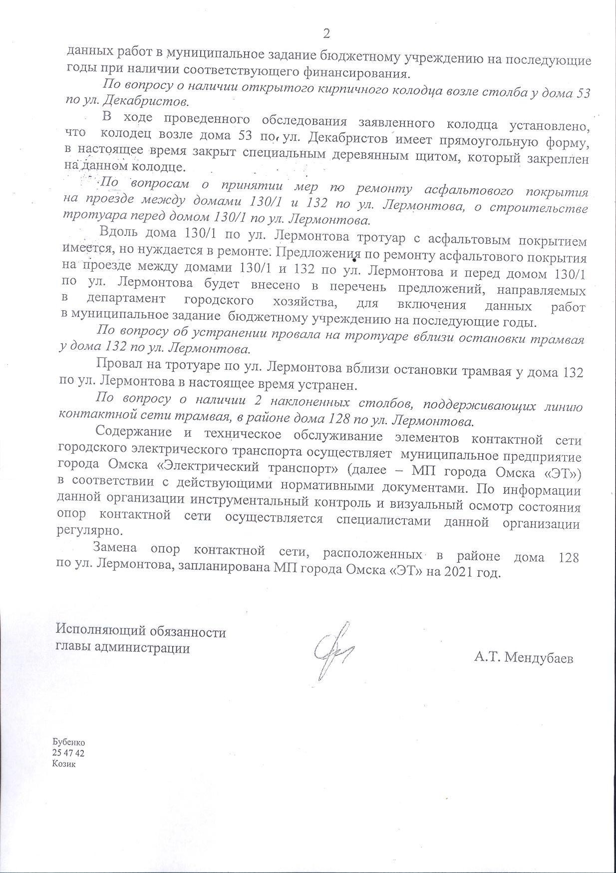 Номер жалобы:56541 Тип жалобы:Прочее Название объекта: Регион:Омская область Город:Омск Адрес:улица Лермонтова, 128 Описание жалобы:Ещё 2 столба сильно отклонены от вертикального положения. Напомню, что эти столбы держат трамвайную линию электропередач. Последствия их падения могут быть очень серьёзными, в том числе могут быть жертвы Статус: