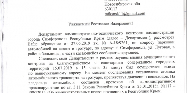 Номер жалобы:56560 Тип жалобы:Прочее Название объекта: Регион:Республика Крым Город:Симферополь Адрес:Луговая улица, 6Н/2Ак1 Описание жалобы:машины паркуются на газонах, тротуарах по ул. Луговой, в обе стороны от больницы. прошу принять меры Статус: