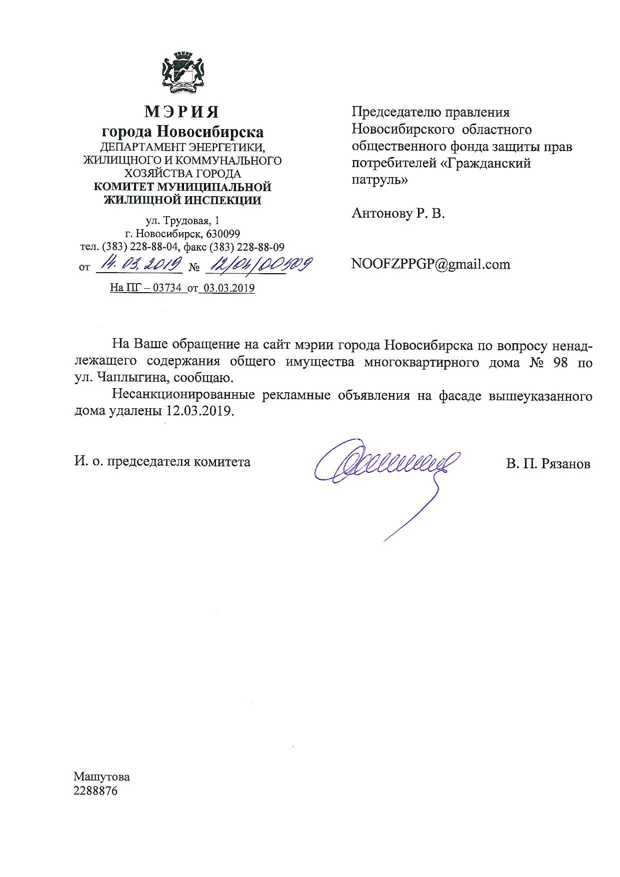 Номер жалобы:50333 Тип жалобы:Иные проблемы ЖКХ Название объекта: Регион:Новосибирская область Город:Новосибирск Адрес:улица Чаплыгина, 100 Описание жалобы:Объявления на хозяйственном корпусе Статус: