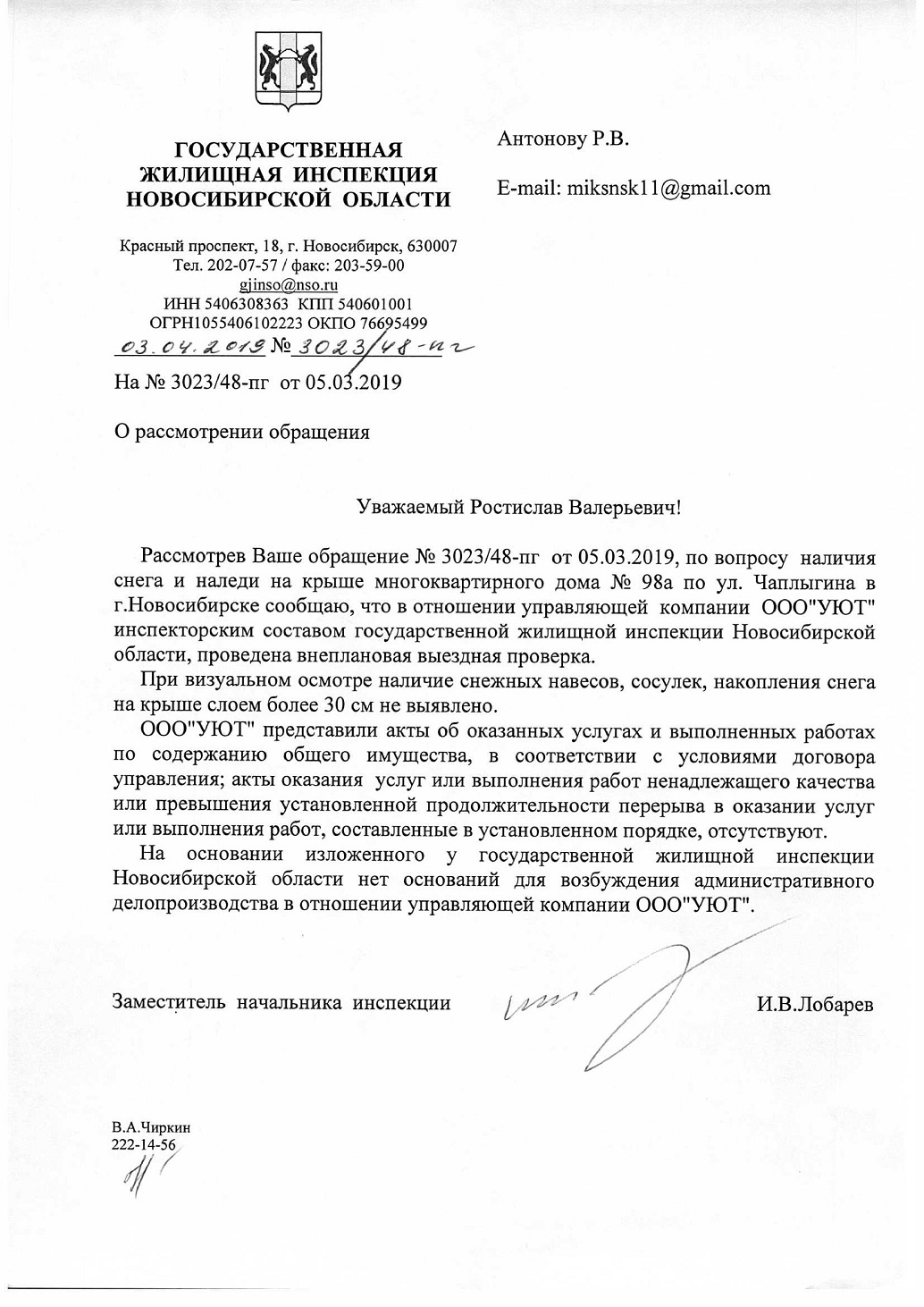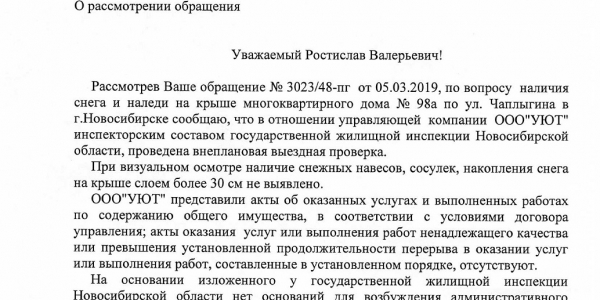 Номер жалобы:50332 Тип жалобы:Иные проблемы ЖКХ Название объекта: Регион:Новосибирская область Город:Новосибирск Адрес:улица Чаплыгина, 98А Описание жалобы:ООО "УЮТ"